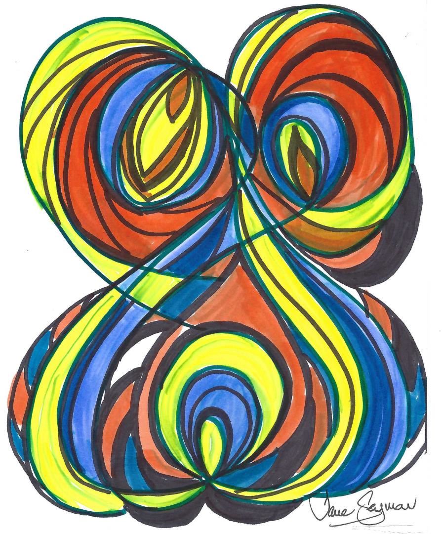 Mixed-media on paper, signed lower right by Jane Seymour ; 8 1/2 x 7" From the Abstract Fantasy Series of colorful designs, this one in the shape of the Open Heart Icon