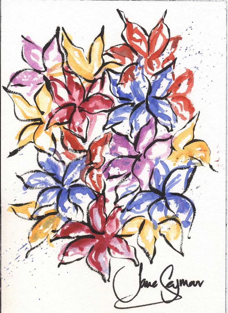 Jane SEYMOUR: Colorful Summer Lilies. Watercolor with pen and ink on paper, signed lower right, 10 1/4 x 7" Jane Seymour's signature style of watercolor with pen and ink, with spatter technique, of one of her favorite flowers, the lilies.