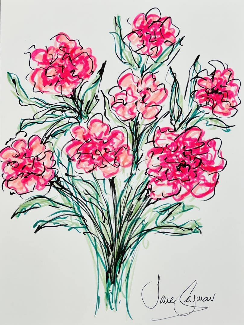 Watercolor with pen & ink on Canson artist board, signed lower right by Jane Seymour ; 12 x 9" Signature style of floral bouquet with pen and ink