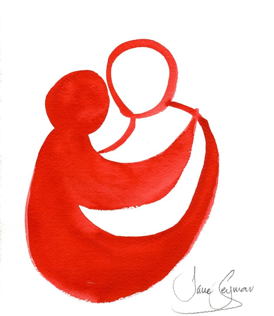 Jane SEYMOUR: Kindness Campaign - Embrace V. (red and white). Watercolor on paper, signed lower right, 10 x 8" Tender illustration of human kindness and caring created for Jane Seymour's Open Heart "Kindness Campaign" Designed for jewelry.