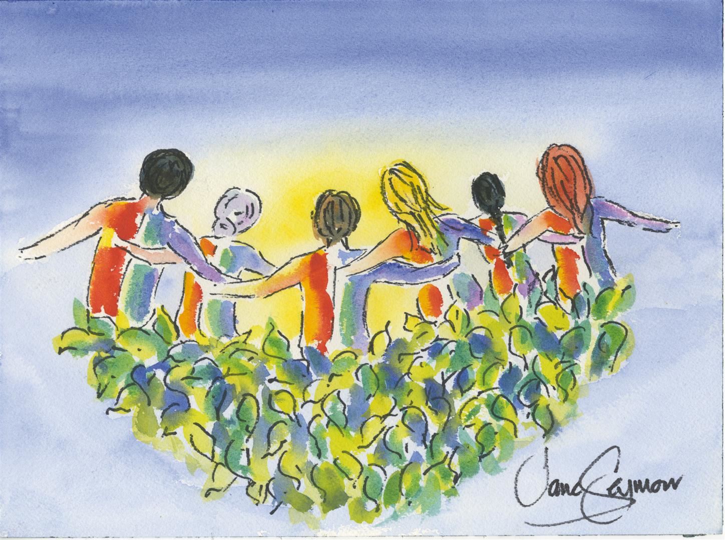 Jane SEYMOUR ORIGINAL: Open Heart Family Growing Together III.. Watercolor with pen and ink on paper, signed lower right, 9 x 12" Through the years the Open Heart Family has grown internationally, and this watercolor is from Jane SEYMOUR ORIGINAL's series of images illustrating the community growing together.