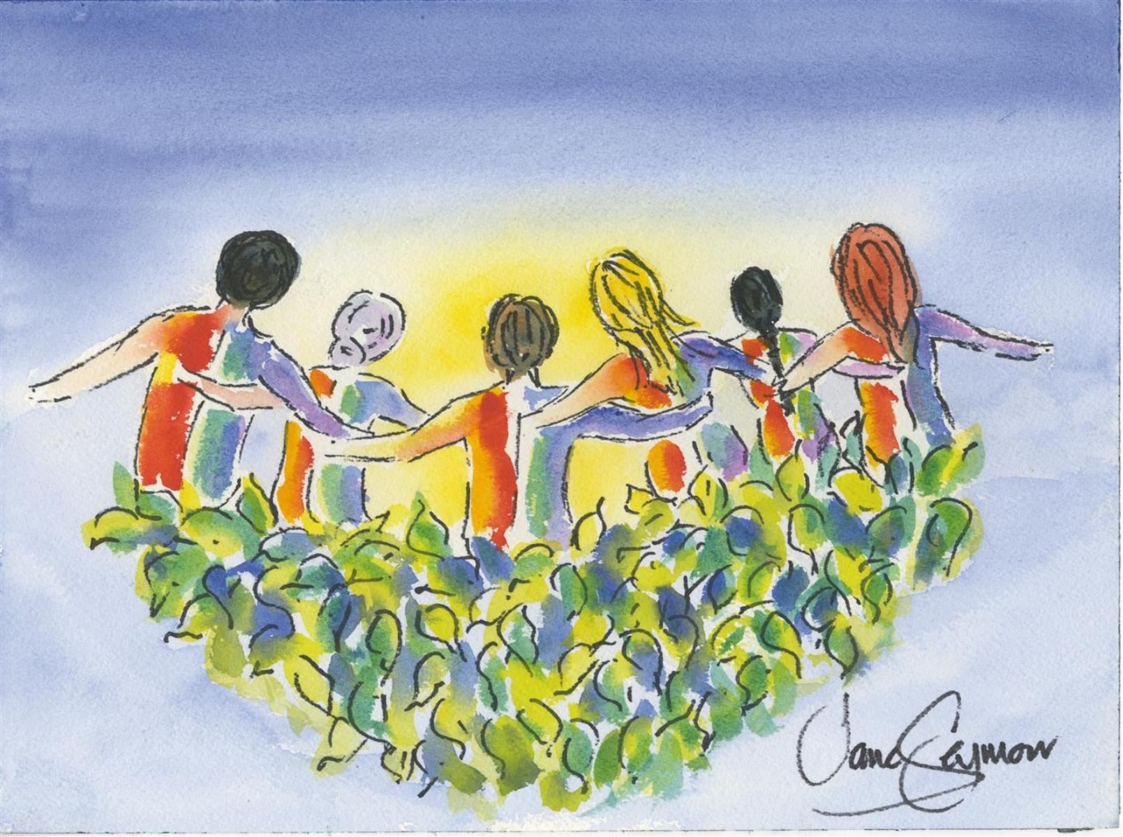 Jane SEYMOUR: Open Heart Family Growing Together III.. Watercolor with pen and ink on paper, signed lower right, 9 x 12" Through the years the Open Heart Family has grown internationally, and this watercolor is from Jane Seymour's series of images illustrating the community growing together.
