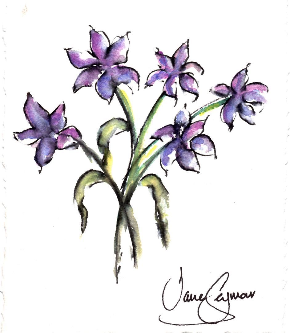 Jane SEYMOUR: Purple Lilies Bunch . Watercolor with pen and ink on paper, signed lower right, 10 x 8" Jane Seymour's signature style of watercolor with pen and ink, of one of her favorite flowers, the lovely lilies.