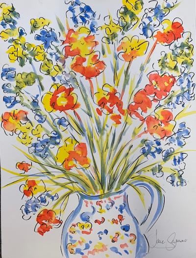 Jane SEYMOUR: Summertime Spray. Watercolor with pen and ink on paper, signed lower right, 16 x 12" A signature style robust bouquet of flowers in a jug to brighten one's day.