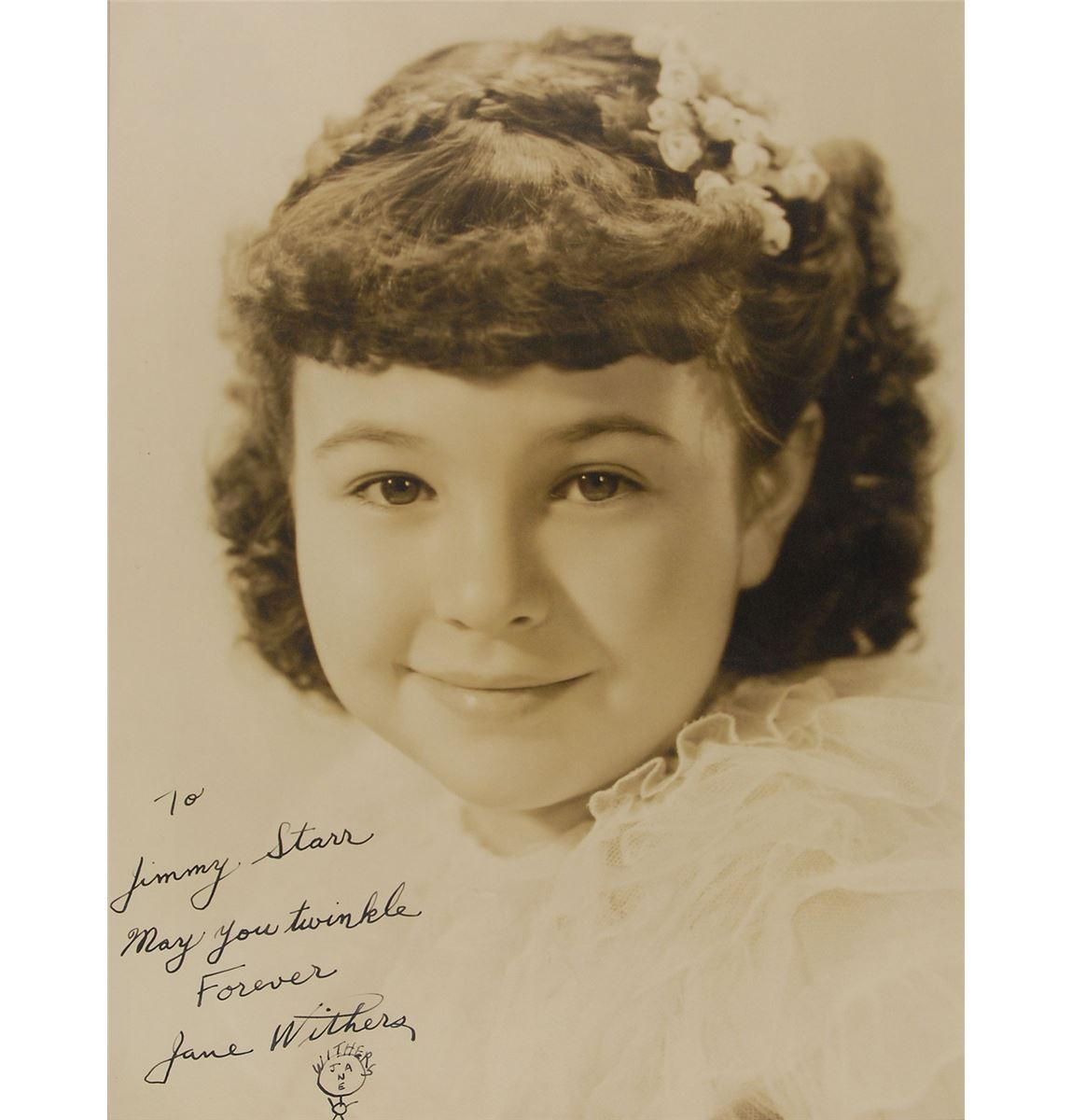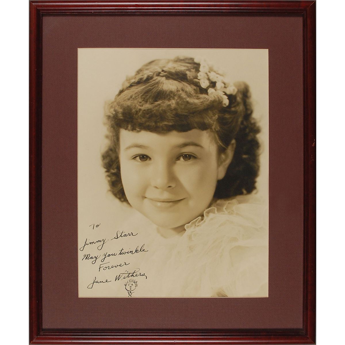 Desirable oversized vintage matte-finish 9.75 x 13 portrait of a young Withers, signed and inscribed in fountain pen, “To Jimmy Starr, May you twinkle Forever, Jane Withers,” adding a creative stick-figure sketch using the letters of her name as the character’s hair and facial features. Matted and framed to an overall size of 15.25 x 18. In fine condition. A Hollywood screenwriter during the 1930s, Jimmy Starr would shift to journalism later on in his career, writing columns for the Los Angeles Herald-Express, the New York Daily Mirror, and the Sunday Daily Mirror. In 2001, Starr released Barefoot on Barbed Wire, an autobiography about his time in Tinseltown. The James Collings Collection.