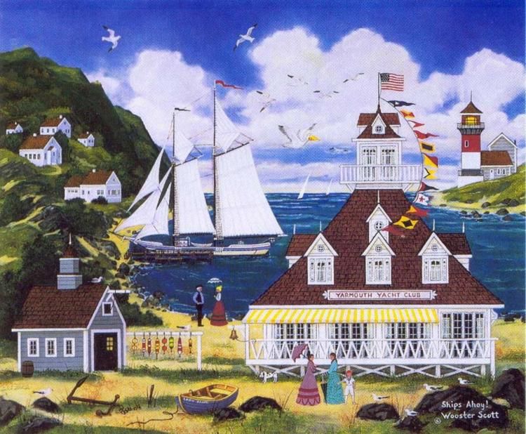 Here is a tall sailing ship off the from the sunny Massachusetts coast. * Artist: Jane Wooster ScottSignature: By the artist, lower rightEdition: Limited, numberedTitle: Ships AhoyMedium: Offset lithograph on paperSheet size: 14" x 16" * Condition: ExcellentBiography: * Wooster Scott * Jane Wooster Scott, who signs her work Wooster Scott, paints dazzling representations of life's celebrations in turn-of-the century and early 20th Century America. * For more than twenty-five years her paintings have summoned memories of a national heritage - the traditions, holidays, and customs of an innocent and energetic young America. Scott's paintings make no statement beyond reminding us that those were indeed the good old days. * In bright, uninhibited colors she revels in the fanciful simplicities of skating on moonlit ponds, country picnics, bobbing for apples at Halloween, hay rides and quilting bees. Her brushes summon a culture only dimly recalled by older Americans, rapidly vanishing memories. * Asked why a modern, sophisticated woman chooses to devote her career to a bygone era, Scott says, "It is really a deep love for Americana, especially those years that seem a perfect time in which to have lived." * "I believe people were more honorable then. Their word was their bond. The pace was slower and more time was given to the appreciation of beauty. People loved their country and they were proud of the fact." * "Then, too, the air and the water and people's minds were cleaner. The family unit was strong and most households included several generations. Front doors were left unbolted. And certainly, there were fewer pressures and tensions. People walked the streets safely at night." * Scott's earliest recollections go back to that section of the country that, even in the 1940's retained glimmerings of the era in which she paints. She was reared in a small eastern Pennsylvania town near picturesque Bucks County to the north and the Amish and Pennsylvania Dutch communities to the west. Family excursions introduced her to red barns with hex signs, isolated white churches crowned with cross-topped steeples, covered wooden bridges and abandoned one-room school houses. * Today, Scott travels to New England, stopping in rural Vermont, Cape Cod, Martha's Vineyard and Nantucket Island seeking inspiration from the pastoral vistas and old buildings. She photographs those landscapes, buildings and oddities to recapture later on canvas. Few of her paintings, however, reflect real, existing scenes. Almost all her compositions are imaginary, drawn from her own thoughts and emotions. * As with most notable artists, Scott's primary consideration in creating a painting is composition and form. Her ideas are first sketched roughly on paper, leaving details for the canvas. Uppermost in her thoughts, however, is the joy of color, which is immediately apparent in all her work. Daring, uninhibited use of the spectrum sets her apart from most contemporaries.The discerning eye often finds a dark haired young girl and/or gangly youth in Wooster Scott paintings. A study of her paintings in chronological order reveals the growth of the youngsters, daughter Ashley and son Vernon IV. The recurring black and white cat is the Scott family pet, Lollipop.Jane Wooster Scott has been expanding her horizons to Japan, Africa, and Europe with exhibitions of her brilliant original oil paintings and serigraphs. Her popularity has spread to such nations as Portugal and Australia through permanent displays in American Embassies as representational of American Traditions. Her art has even graced the walls of The White House. She has had major shows in New York, Los Angeles, Boston, Atlanta, and many other cities and towns across the United States. She has received high critical acclaim and most of her shows have completely sold out on opening night. *