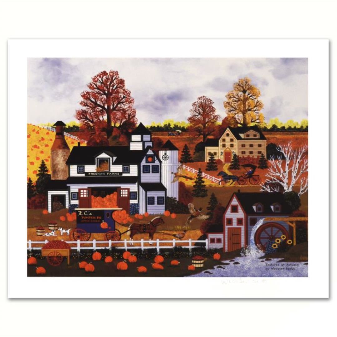 Cozy, down-home images of a bygone era when life was simpler - this is the feeling captured in the creations of one of the world's most recognized artists. "Textures of Autumn" is a limited edition lithograph on paper, numbered and hand signed by Wooster Scott. Includes letter of authenticity. Measures approx. 16" x 14" (with border), 14" x 12" (image)