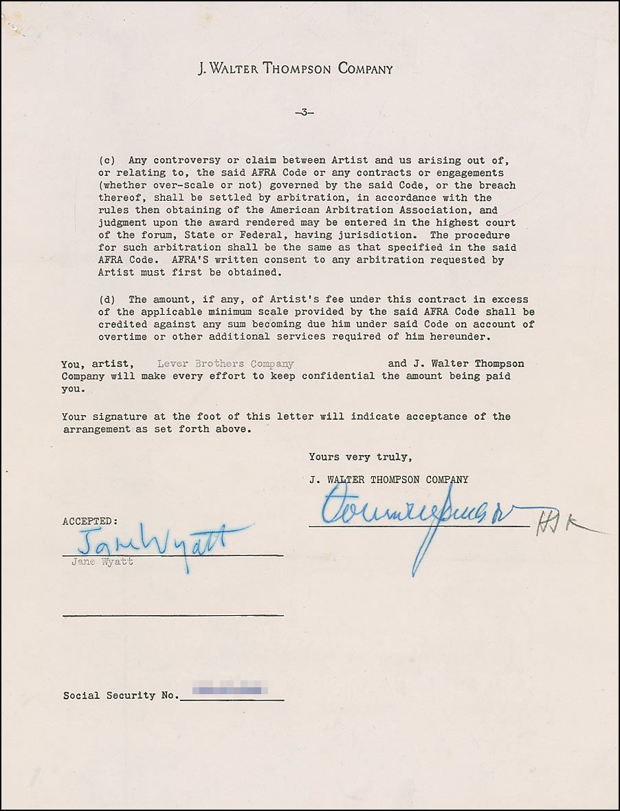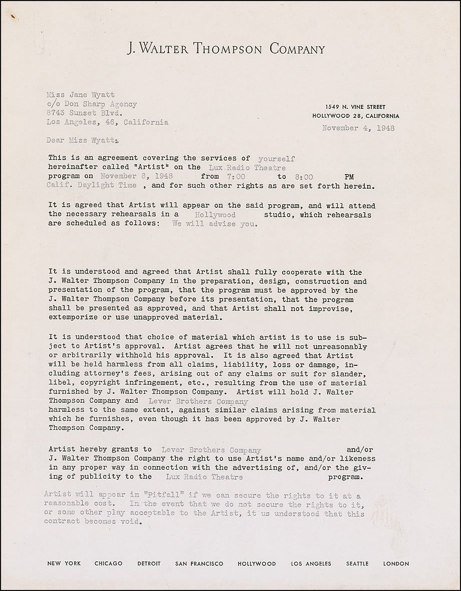 DS, three pages, 8.5 x 11, November 4, 1948. Agreement between Wyatt and the J. Walter Thompson Company regarding Wyatt’s engagement with the Lux Radio Theatre program for November 8, 1948, in which the actress agrees to appear and attend all necessary rehearsals. Wyatt agrees to appear in “‘Pitfall’ if we can secure the rights to it at a reasonable cost,” and complies with a compensation in the amount of $500 for her services. In fine condition, with rusty staple marks to the top left corner of each page, and haloing to the signature.