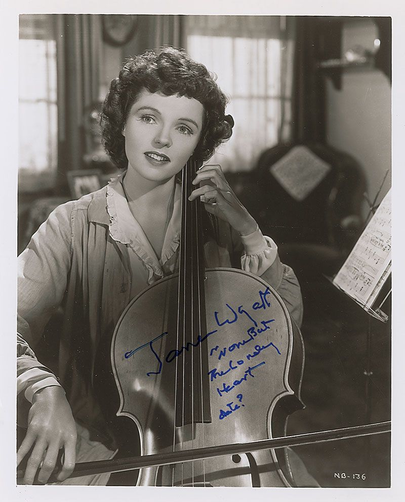 Glossy 8 x 10 photo of Wyatt playing the cello, signed in blue felt tip, “Jane Wyatt, None But the Lonely Heart, date?” In fine condition.
