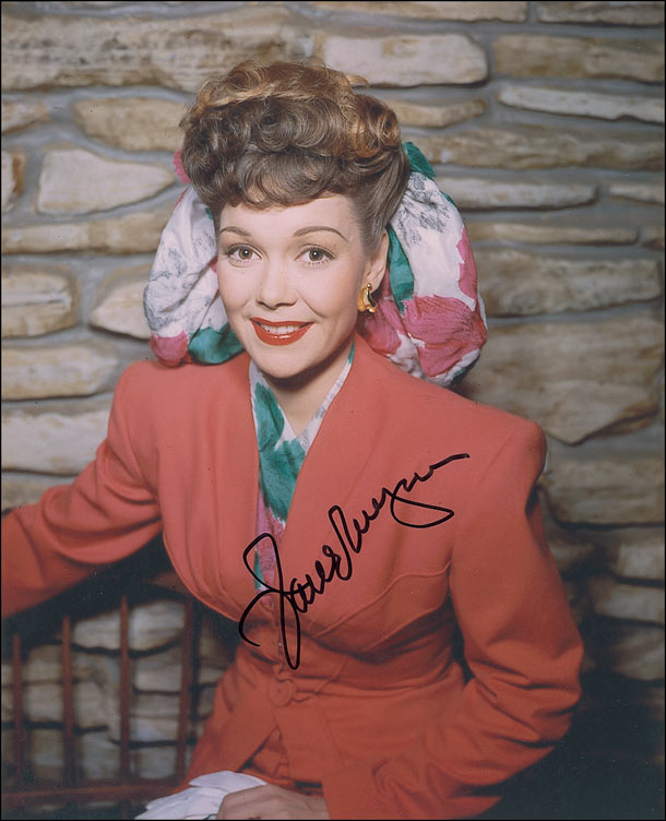 Color glossy 8 x 10 photo of Wyman sitting in front of a stone wall, signed in black felt tip, “Jane Wyman.” In very fine condition.