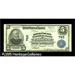 <B>Janesville, WI</B></I> - $5 1902 Plain Back Fr. 598 <B>The Rock County NB </B></I> Ch. # 749<BR>We sold an Extremely Fine of this denomination from here at our 2004 Central States Numismatic Society auction for $1,610, while the previous year at that same organization's convention in St. Louis a soiled About VF went for $437.00. This bright and crispy <B>Very Fine-Extremely Fine</B></I> is a new addition to the census and will see results likely toward the upper end of the previous range, probably at about... Lot:17019
