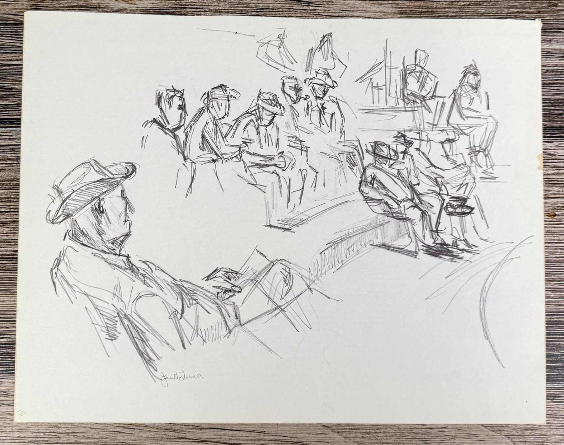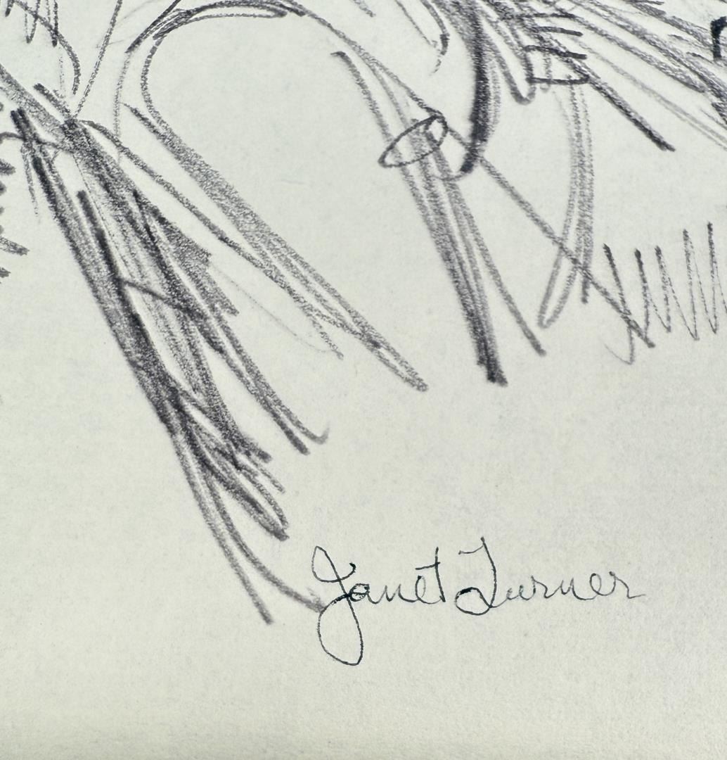 10 3/8" by 13 1/2". Janet Elizabeth Turner (1914 - 1988) was active/lived in California, Kansas. Janet Turner is known for Figure, genre, and landscape painter, printmaking. Janet Elizabeth Turner, primarily known as a graphic artist of Western subjects, though painting, as well, was born on April 7, 1914, in Kansas City, Missouri, growing up there. Her art studies got off to an uncertain start, when initially she studied biology at Stanford, changing her major to Far Eastern history when the University dropped the biology program in her junior year. Then she took some drawing courses in her senior year, graduating in 1936. Her real art education began when she studied painting with Regionalist artist Thomas Hart Benton from 1937-1941 at the Kansas City Art Institute. She also studied printmaking there with John DeMartelly. Her studies later continued at the Claremont Graduate School, California, with Henry McFee and Millard Sheets, resulting in her M.F.A. degree in 1947. She also studied silkscreen with Edward Landon. In 1952, Turner attended summer school at Columbia University Teachers College, receiving her Ph.D. in education in 1960, following additional study from 1956-1958. Once her art education finally got under way, it was clearly extensive. Turner's subjects included rural and small town settings in Kansas, Colorado, Missouri, and Texas and, after 1959, a strong emphasis on Western wildlife. Some works include Goats in Pinon Canyon; New Mexico Dwellings; Immature Golden Eagle; White Leghorns; Bulldogging Stock; Guinea Fowl, Among the Tule; and Dead Snow Goose. Turner taught at Girls Collegiate School, Claremont (1942-1947); Stephen F. Austin State College, Nacogdoches, TX (1947-1956); then, in 1959, California State University at Chico, continuing there until her retirement in 1983. She was named an "Outstanding Professor" in the California State University system in 1975. Jane Turner's work may be found in the collections of the Metropolitan Museum of Art, New York; Philadelphia Museum of Art, Pennsylvania; Cleveland Museum of Art, Ohio; San Francisco Museum of Art, California; Benzalei National Museum, Jerusalem; Bibliotheque Nationale, Paris; Victoria and Albert Museum, London; Society of Wildlife Art of the Nations, Gloucester, England; Portland Museum of Art, Oregon; William Rockhill Nelson-Atkins Museum of Art, Kansas City, Missouri; Dallas Museum of Art, Texas; and the National Museum of American Art and the Smithsonian Institution, both in Washington, DC. Turner first exhibited her work around 1937 in Kansas City as a student at the Art Institute. That started the ball rolling in a career that saw ultra-numerous exhibitions, including two hundred one-person shows of prints and paintings in forty of the United States, and in twenty-three cities in Japan and Israel. She would show her work in every state in the Union, and in fifty countries on six continents, including the Metropolitan Museum of Art's American Painting Today, in 1950, and their Watercolors and Prints, in 1952; the New York World's Fair, 1964-1965; print annuals and biennials at the National Academy of Design, New York City; American Color Print Society; Brooklyn Museum; Print Club of Philadelphia, and Society of American Graphic Artists. Janet Elizabeth Turner died June 27, 1988, in Chico, California.