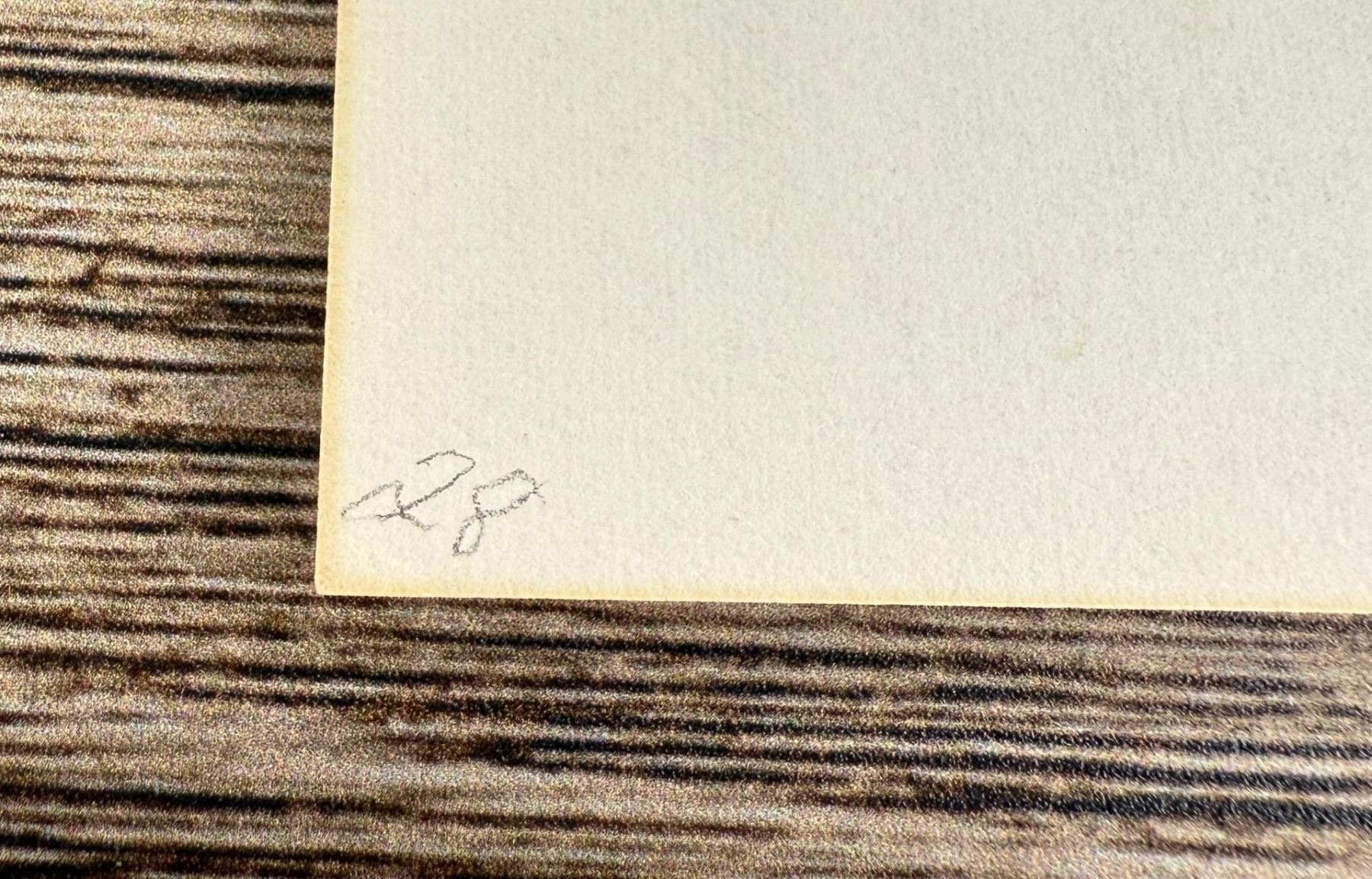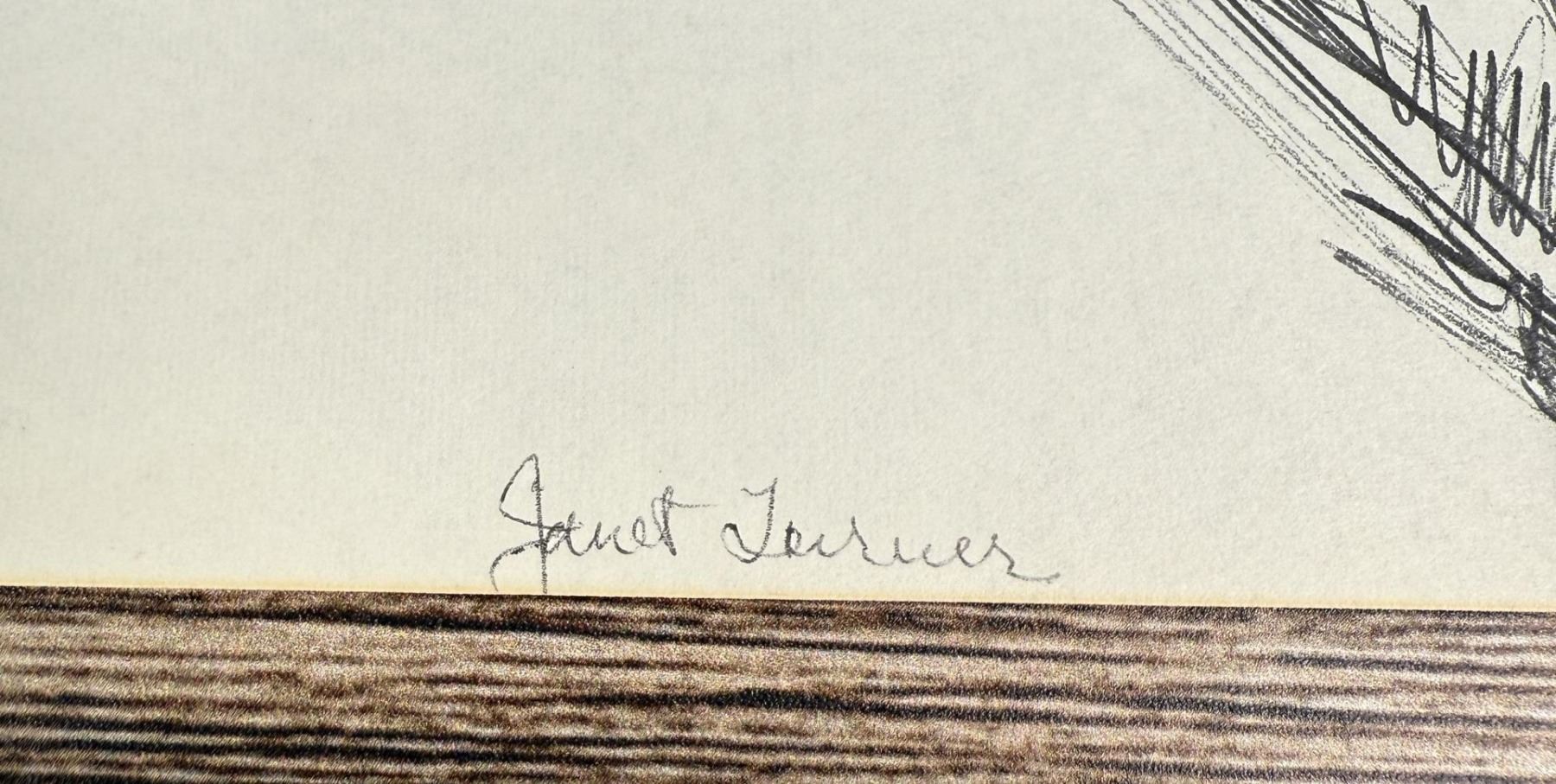 10 3/8" by 13 1/2". Janet Elizabeth Turner (1914 - 1988) was active/lived in California, Kansas. Janet Turner is known for Figure, genre, and landscape painter, printmaking. Janet Elizabeth Turner, primarily known as a graphic artist of Western subjects, though painting, as well, was born on April 7, 1914, in Kansas City, Missouri, growing up there. Her art studies got off to an uncertain start, when initially she studied biology at Stanford, changing her major to Far Eastern history when the University dropped the biology program in her junior year. Then she took some drawing courses in her senior year, graduating in 1936. Her real art education began when she studied painting with Regionalist artist Thomas Hart Benton from 1937-1941 at the Kansas City Art Institute. She also studied printmaking there with John DeMartelly. Her studies later continued at the Claremont Graduate School, California, with Henry McFee and Millard Sheets, resulting in her M.F.A. degree in 1947. She also studied silkscreen with Edward Landon. In 1952, Turner attended summer school at Columbia University Teachers College, receiving her Ph.D. in education in 1960, following additional study from 1956-1958. Once her art education finally got under way, it was clearly extensive. Turner's subjects included rural and small town settings in Kansas, Colorado, Missouri, and Texas and, after 1959, a strong emphasis on Western wildlife. Some works include Goats in Pinon Canyon; New Mexico Dwellings; Immature Golden Eagle; White Leghorns; Bulldogging Stock; Guinea Fowl, Among the Tule; and Dead Snow Goose. Turner taught at Girls Collegiate School, Claremont (1942-1947); Stephen F. Austin State College, Nacogdoches, TX (1947-1956); then, in 1959, California State University at Chico, continuing there until her retirement in 1983. She was named an "Outstanding Professor" in the California State University system in 1975. Jane Turner's work may be found in the collections of the Metropolitan Museum of Art, New York; Philadelphia Museum of Art, Pennsylvania; Cleveland Museum of Art, Ohio; San Francisco Museum of Art, California; Benzalei National Museum, Jerusalem; Bibliotheque Nationale, Paris; Victoria and Albert Museum, London; Society of Wildlife Art of the Nations, Gloucester, England; Portland Museum of Art, Oregon; William Rockhill Nelson-Atkins Museum of Art, Kansas City, Missouri; Dallas Museum of Art, Texas; and the National Museum of American Art and the Smithsonian Institution, both in Washington, DC. Turner first exhibited her work around 1937 in Kansas City as a student at the Art Institute. That started the ball rolling in a career that saw ultra-numerous exhibitions, including two hundred one-person shows of prints and paintings in forty of the United States, and in twenty-three cities in Japan and Israel. She would show her work in every state in the Union, and in fifty countries on six continents, including the Metropolitan Museum of Art's American Painting Today, in 1950, and their Watercolors and Prints, in 1952; the New York World's Fair, 1964-1965; print annuals and biennials at the National Academy of Design, New York City; American Color Print Society; Brooklyn Museum; Print Club of Philadelphia, and Society of American Graphic Artists. Janet Elizabeth Turner died June 27, 1988, in Chico, California.