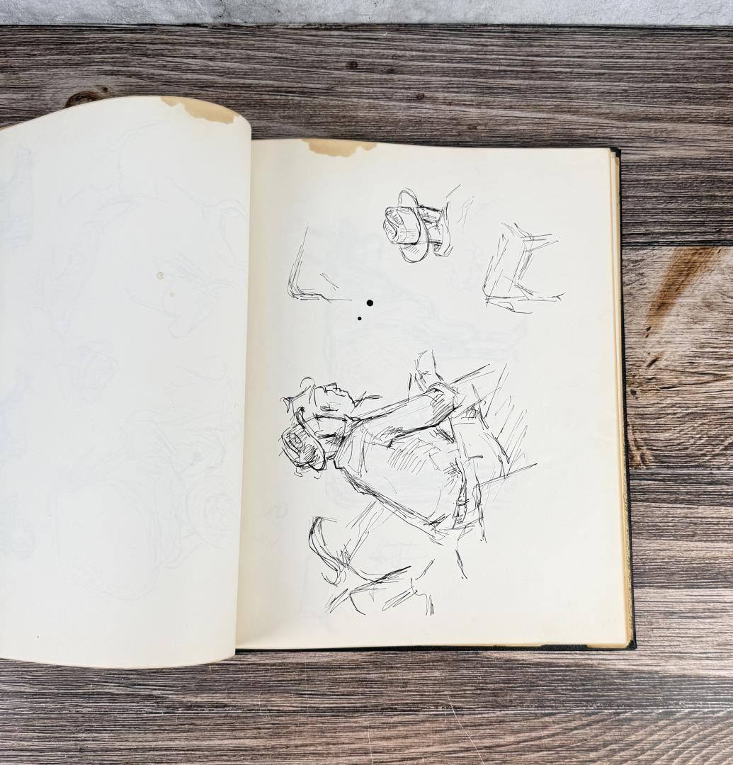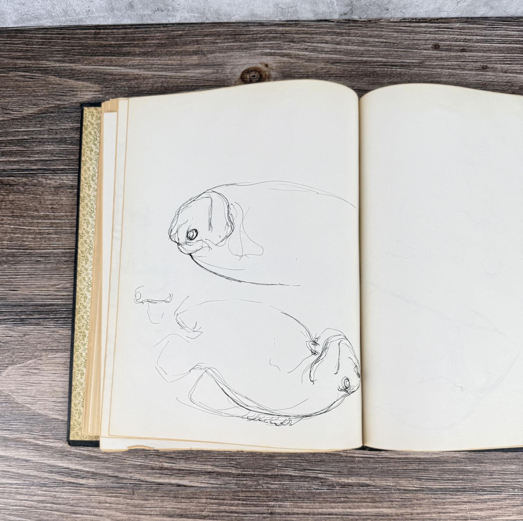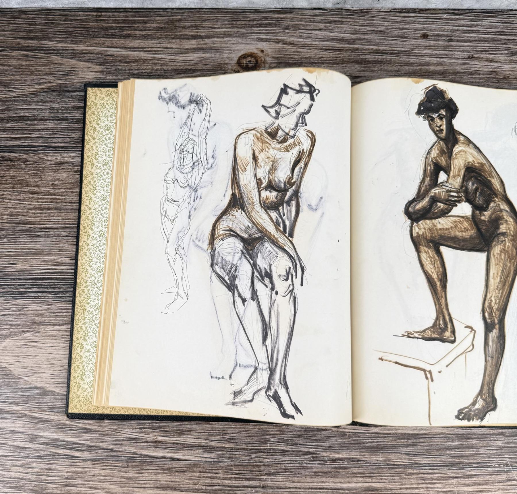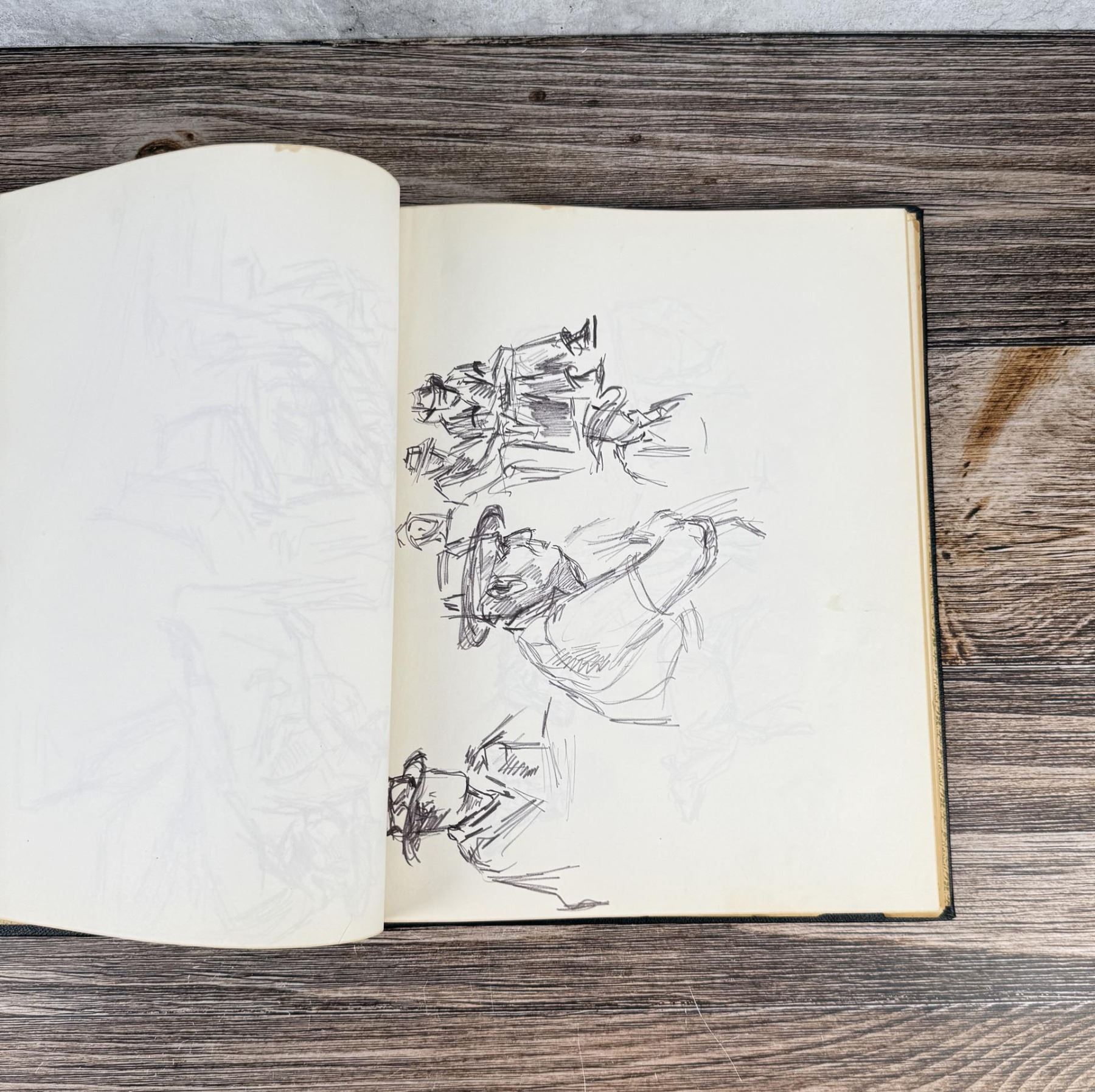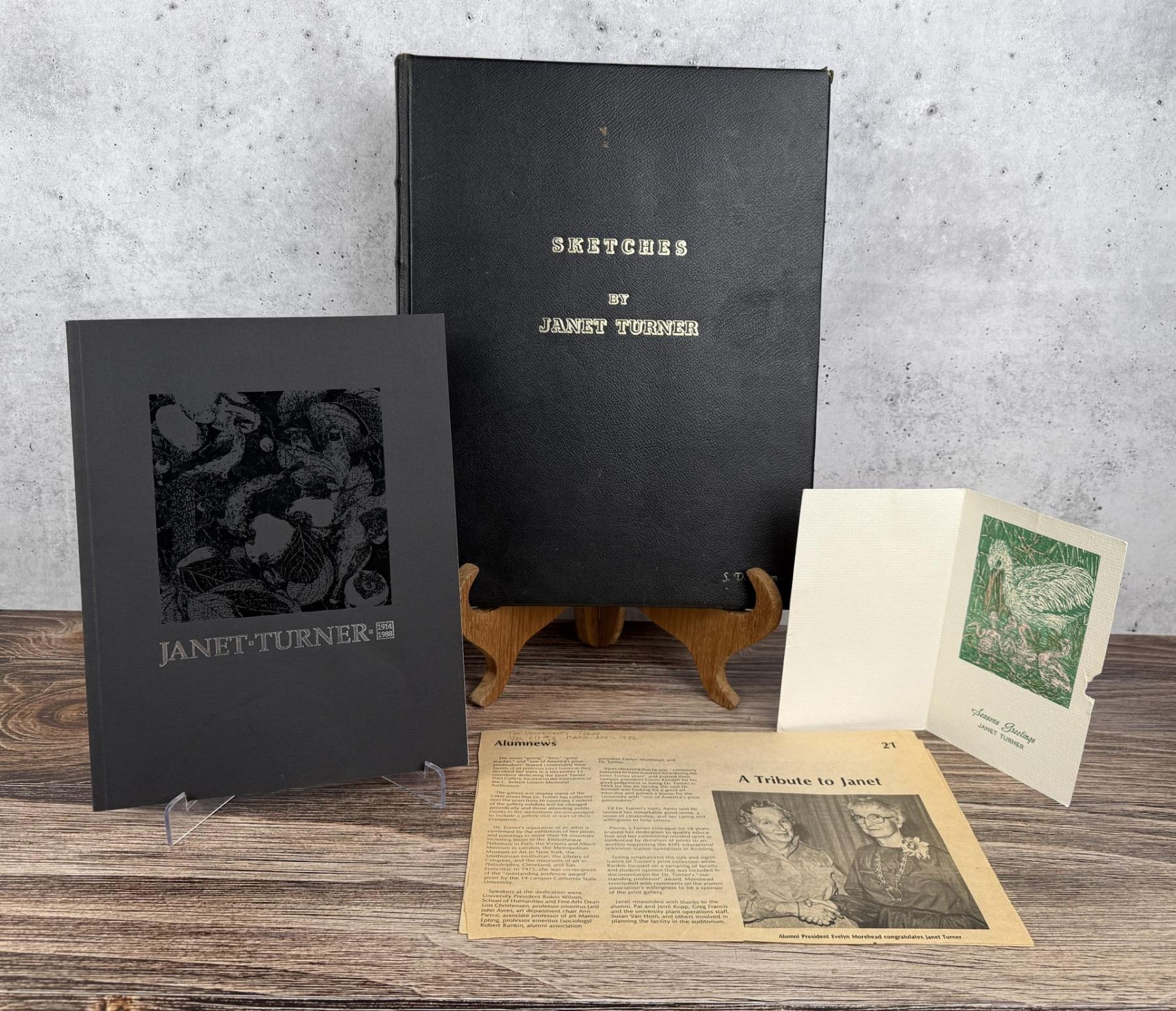 Very nice grouping including a full original Sketch Book. Janet Elizabeth Turner (1914 - 1988) was active/lived in California, Kansas. Janet Turner is known for Figure, genre, and landscape painter, printmaking. Janet Elizabeth Turner, primarily known as a graphic artist of Western subjects, though painting, as well, was born on April 7, 1914, in Kansas City, Missouri, growing up there. Her art studies got off to an uncertain start, when initially she studied biology at Stanford, changing her major to Far Eastern history when the University dropped the biology program in her junior year. Then she took some drawing courses in her senior year, graduating in 1936. Her real art education began when she studied painting with Regionalist artist Thomas Hart Benton from 1937-1941 at the Kansas City Art Institute. She also studied printmaking there with John DeMartelly. Her studies later continued at the Claremont Graduate School, California, with Henry McFee and Millard Sheets, resulting in her M.F.A. degree in 1947. She also studied silkscreen with Edward Landon. In 1952, Turner attended summer school at Columbia University Teachers College, receiving her Ph.D. in education in 1960, following additional study from 1956-1958. Once her art education finally got under way, it was clearly extensive. Turner's subjects included rural and small town settings in Kansas, Colorado, Missouri, and Texas and, after 1959, a strong emphasis on Western wildlife. Some works include Goats in Pinon Canyon; New Mexico Dwellings; Immature Golden Eagle; White Leghorns; Bulldogging Stock; Guinea Fowl, Among the Tule; and Dead Snow Goose. Turner taught at Girls Collegiate School, Claremont (1942-1947); Stephen F. Austin State College, Nacogdoches, TX (1947-1956); then, in 1959, California State University at Chico, continuing there until her retirement in 1983. She was named an "Outstanding Professor" in the California State University system in 1975. Jane Turner's work may be found in the collections of the Metropolitan Museum of Art, New York; Philadelphia Museum of Art, Pennsylvania; Cleveland Museum of Art, Ohio; San Francisco Museum of Art, California; Benzalei National Museum, Jerusalem; Bibliotheque Nationale, Paris; Victoria and Albert Museum, London; Society of Wildlife Art of the Nations, Gloucester, England; Portland Museum of Art, Oregon; William Rockhill Nelson-Atkins Museum of Art, Kansas City, Missouri; Dallas Museum of Art, Texas; and the National Museum of American Art and the Smithsonian Institution, both in Washington, DC. Turner first exhibited her work around 1937 in Kansas City as a student at the Art Institute. That started the ball rolling in a career that saw ultra-numerous exhibitions, including two hundred one-person shows of prints and paintings in forty of the United States, and in twenty-three cities in Japan and Israel. She would show her work in every state in the Union, and in fifty countries on six continents, including the Metropolitan Museum of Art's American Painting Today, in 1950, and their Watercolors and Prints, in 1952; the New York World's Fair, 1964-1965; print annuals and biennials at the National Academy of Design, New York City; American Color Print Society; Brooklyn Museum; Print Club of Philadelphia, and Society of American Graphic Artists. Janet Elizabeth Turner died June 27, 1988, in Chico, California.