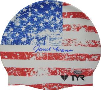 In 1987, Janet Evans broke the world records in the 400-meter, 800-meter, and 1,500-meter freestyle distances. At the 1988 Summer Olympics in Seoul, South Korea, she won three individual gold medals. In these Olympics, Evans set a new world record in the 400-meter freestyle event. This record stood for 18 years until France's Laure Manaudou broke it in May 2006.At the end of Evans' swimming career, she held seven world records, five Olympic medals (including four gold medals), and 45 American national titles. Janet Evans has hand signed this Olympics Team USA American Flag TYR Swim Cap. Leaf Authentics Hologram and Certificate of Authenticity from Athlon Sports.