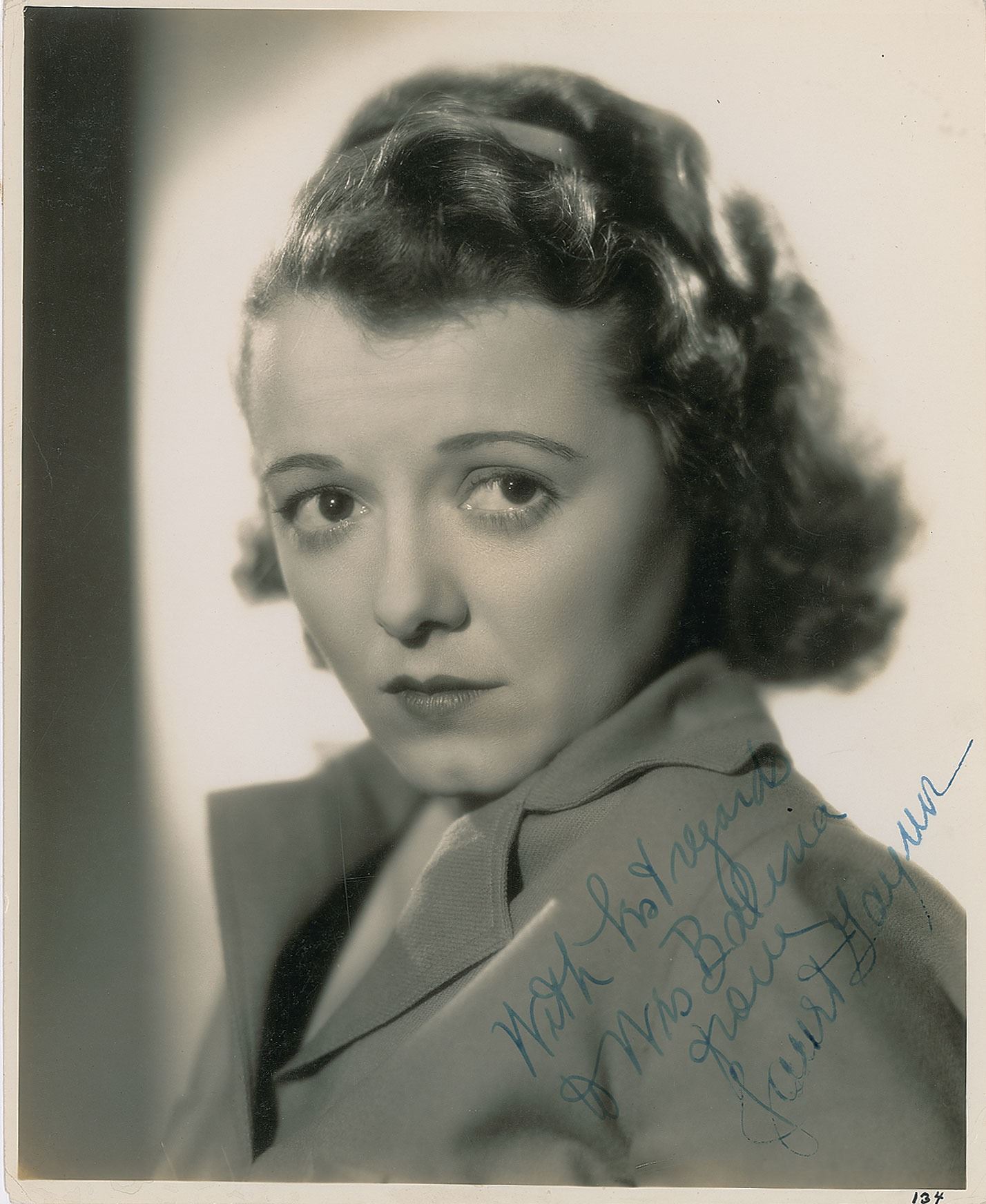 Lovely vintage glossy 7.75 x 9.5 photo of the premiere Best Actress Oscar winner in a lovely up-close pose, signed and inscribed in fountain pen, "With best regards to Mrs. Baleria, from Janet Gaynor.” Reverse bears a Fox Film and Otto Dyar credit stamp. In fine condition, with trimmed edges.