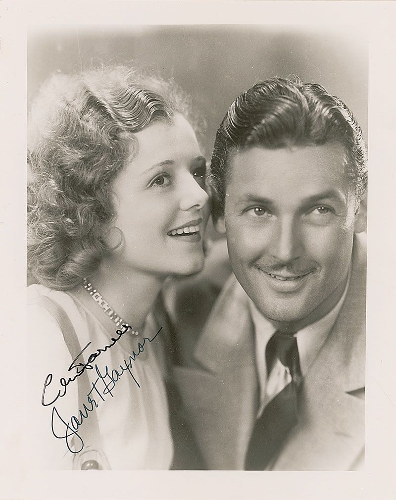 Glossy 8 x 10 photo of the couple, signed in black felt tip by both Janet Gaynor and Charles Farrell. In fine condition.