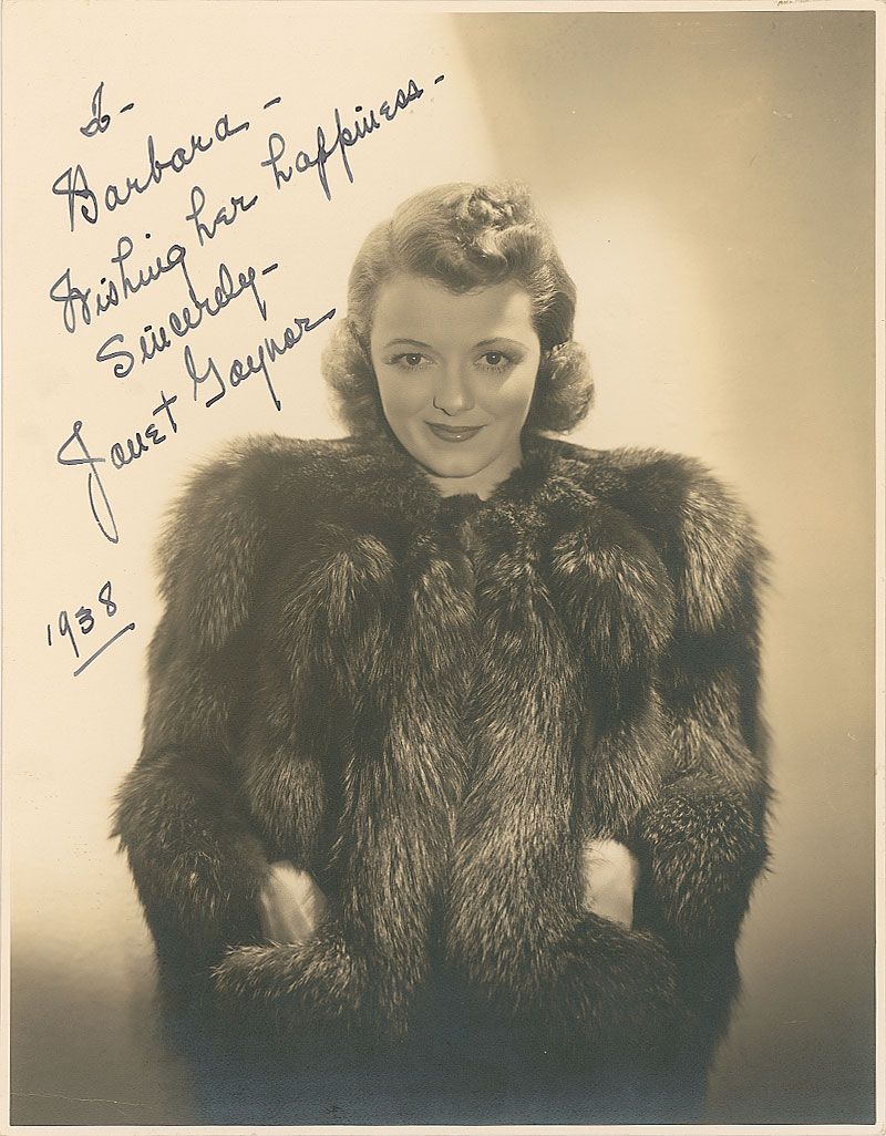 Charming vintage matte-finish 7.25 x 9.25 photo of Gaynor in a fur coat, signed and inscribed in fountain pen “To Barbara—Wishing her happiness—Sincerely—Janet Gaynor 1938.” In fine condition, with a crease to lower left and some scattered light silvering.