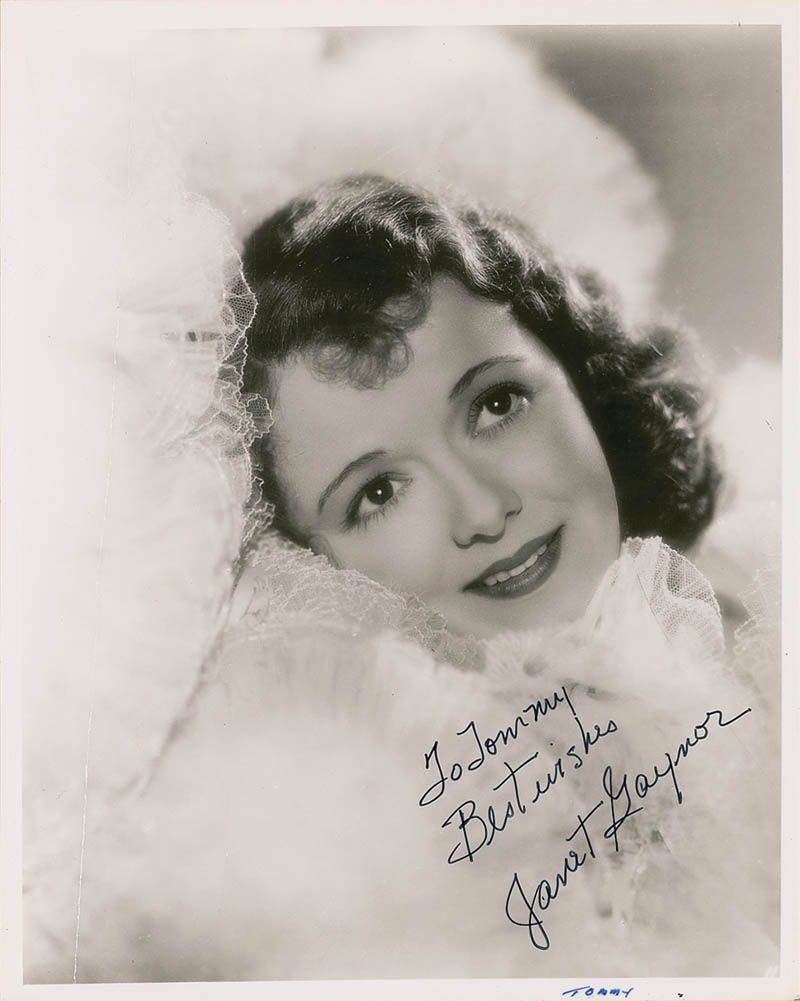 Glossy 8 x 10 photo of Gaynor surrounded by lace, signed and inscribed in black felt tip “To Tommy, Best wishes, Janet Gaynor.” In fine condition, with a felt tip notation to bottom border.