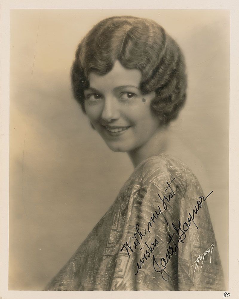 Lovely pearl-finish 8 x 10 photo of Gaynor looking over her shoulder, signed in black felt tip, “With my best wishes, Janet Gaynor.” In fine condition, with a spot to the finish near her cheek.