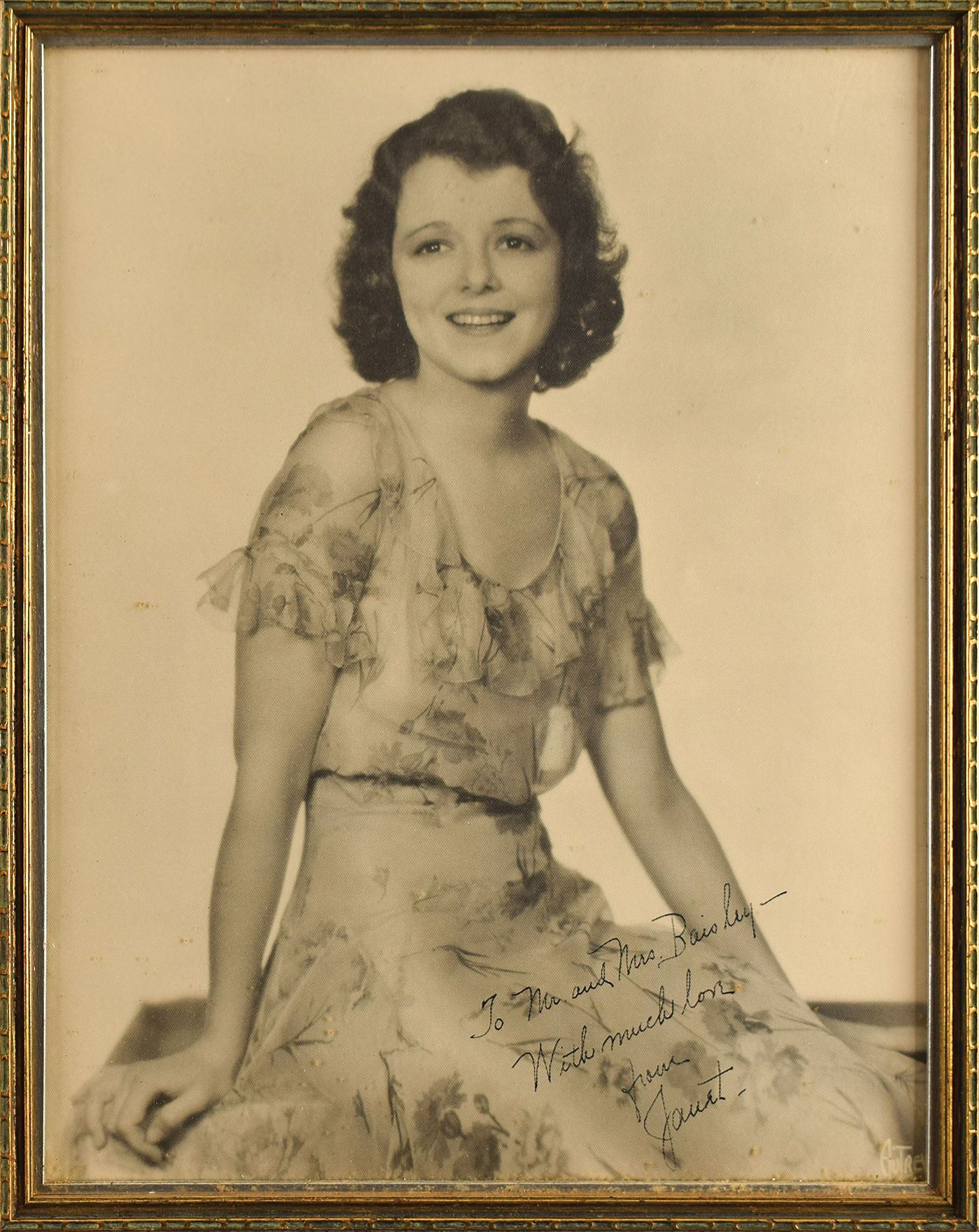 Wonderful vintage matte-finish 10.25 x 13.25 photo of Gaynor in a floral dress by the Autrey Studio of Hollywood, signed and inscribed in fountain pen, "To Mr. and Mrs. Baisley—With much love, from, Janet.” Framed and in fine condition. An uncommonly large portrait of the first recipient of the Best Actress Oscar.
