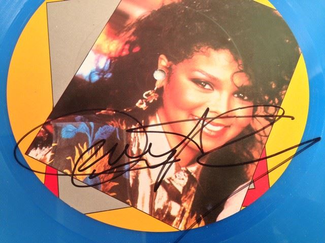 Janet Jackson autographed blue vinyl record album "When I Think of You", signed in black sharpie over her photo decorating the front of the record. The album does not come with a record sleeve. (12" diameter).