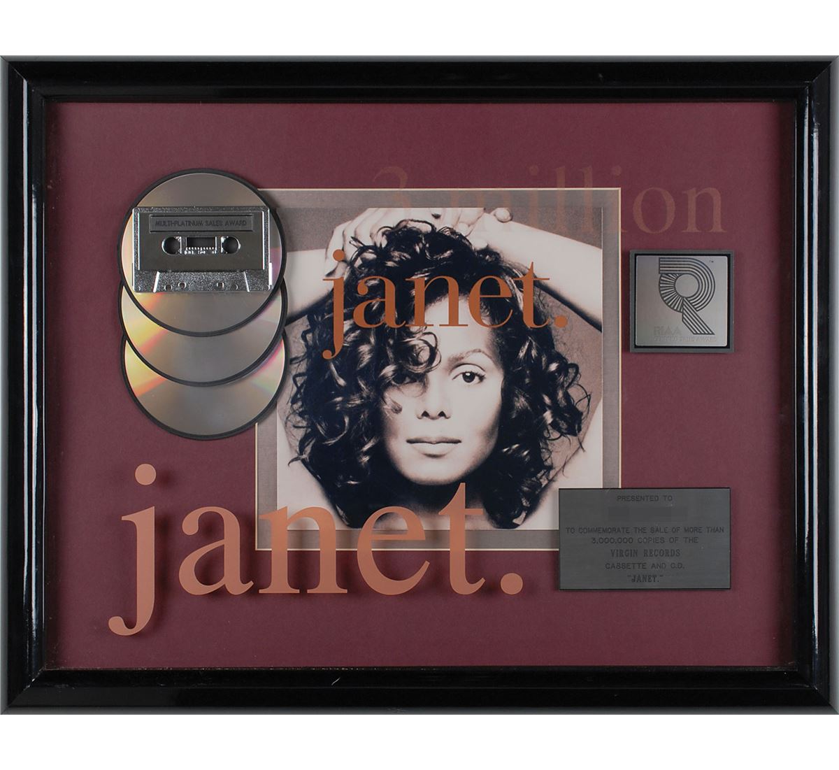 Official ‘R’ hologram-style RIAA multi-platinum sales award presented “to commemorate the sale of more than 3,000,000 copies of the Virgin Records cassette and C.D. ‘Janet.’” Framed with its cassette, CDs, plate, and a large image of the album cover to an overall size of 24.25 x 19.5. Award retains its original backing with an Ill-Eagle Enterprises label. In fine condition. Oversized.