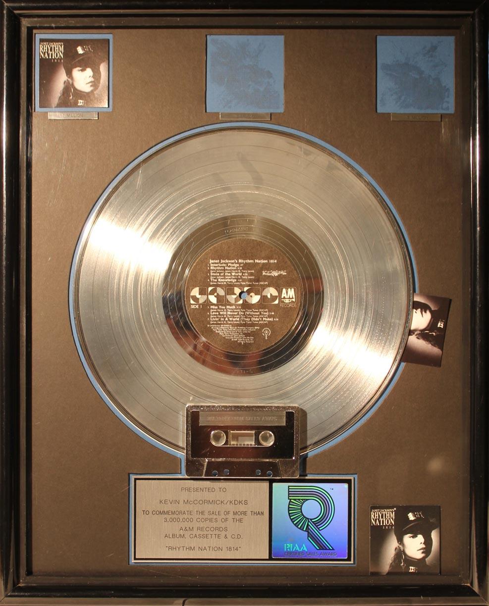 Platinum record of Janet Jackson's ''Rhythm Nation'' issued by the Recording Industry Association of America (RIAA) and presented to Kevin McCormick/KDKS to commemorate the sale of more than 3,000,000 copies sold. Two spaces in the mat are empty as the photos occupying that space have fallen to the bottom of the frame. Paper on the album is a little loose and some condensation may have entered the frame, overall in very good condition.