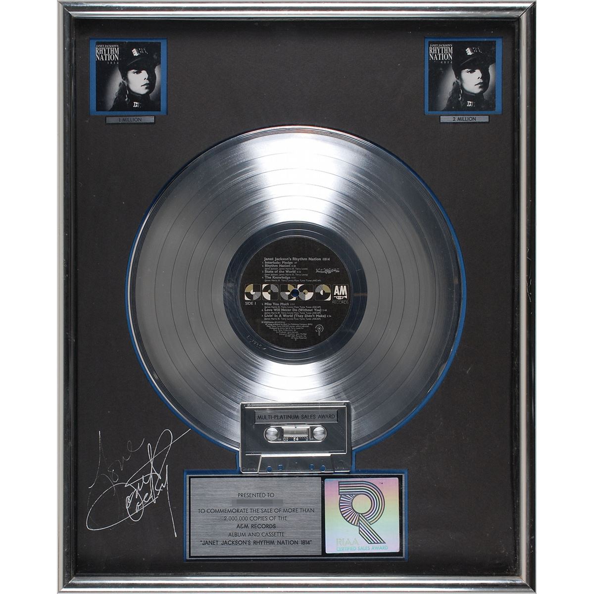 Official ‘R’ hologram-style RIAA multi–platinum sales award presented “to commemorate the sale of more than 2,000,000 copies of the A&M Records album and cassette ‘Janet Jackson’s Rhythm Nation 1814.’” Framed with its disc, plate, a cassette, two images of the album cover, and signed in silver ink to the lower left of the mat, “Love, Janet Jackson,” to an overall size of 16.75 x 20.75. Award retains its original backing with a Fitzgerald Hartley label. In fine condition, with a separation to the upper right corner of the frame.