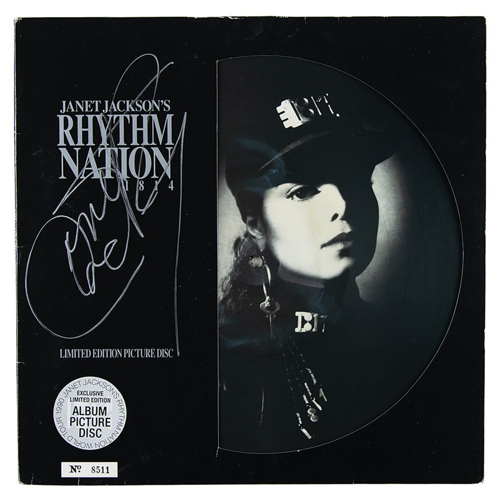 Limited edition Rhythm Nation picture disc album (no. 8511) signed on the die-cut sleeve in silver ink by Janet Jackson. In fine condition. The record is included.