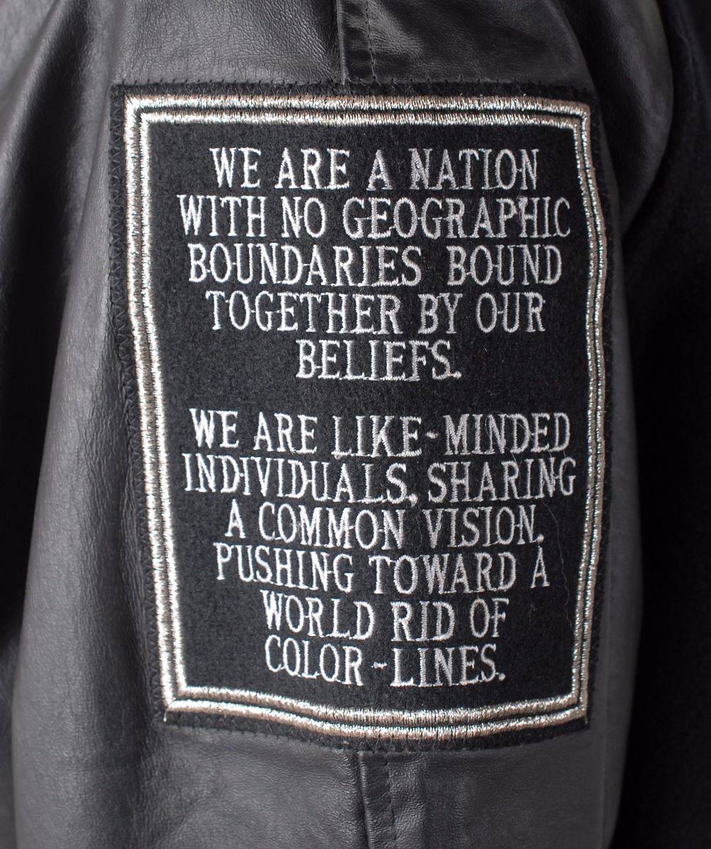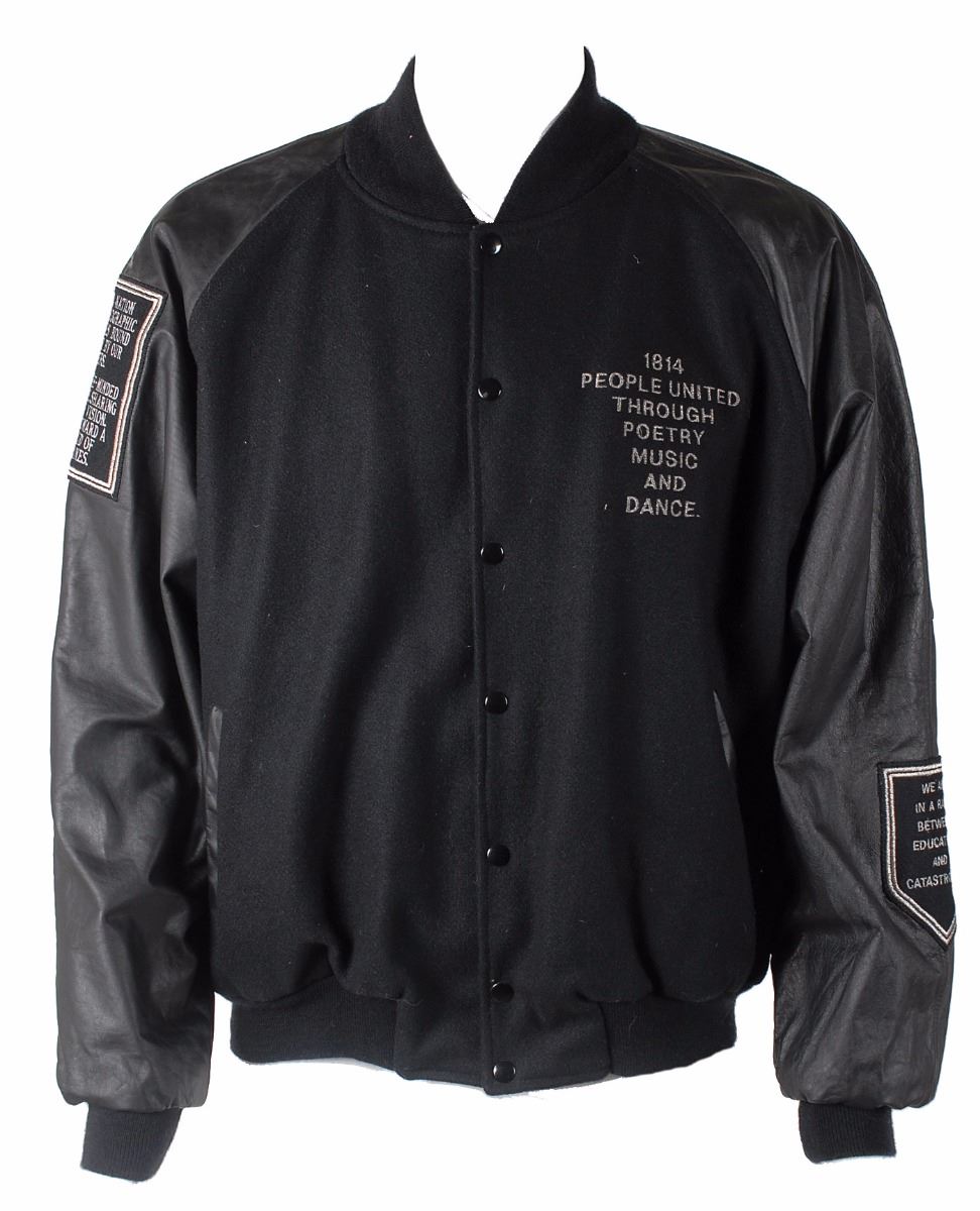 Black tour jacket for the 1990 Rhythm Nation world tour, size large, constructed of wool and leather with a satin acetate lining, manufactured by LP Designs, with fine embroidery on the front and back and patches on both sleeves. In fine condition.
