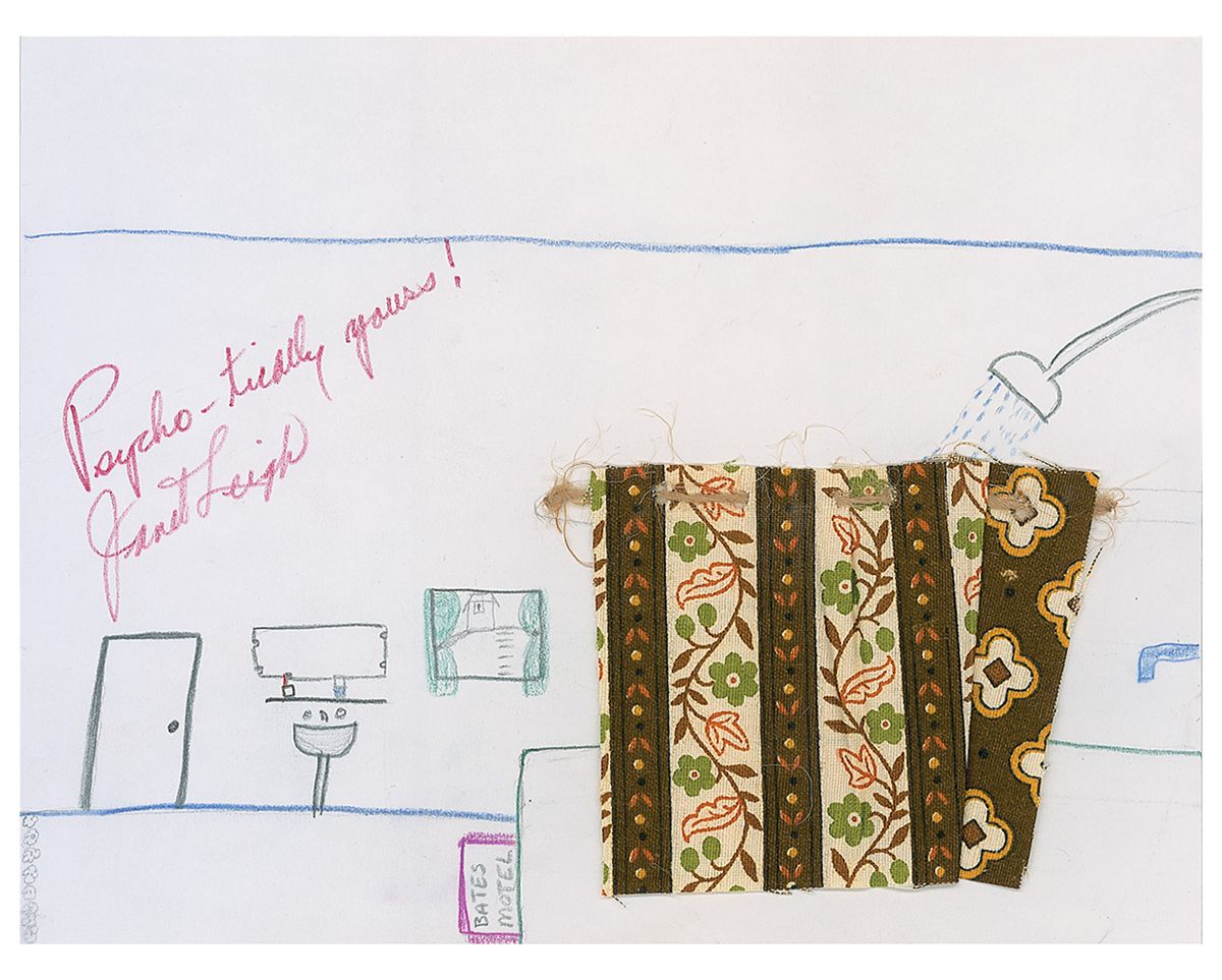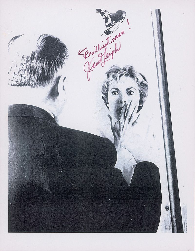An original pencil and crayon artwork done by Leigh, of her famous shower scene at the Bates Motel in Psycho, complete with a fabric shower curtain, on an 11 x 8.5 off-white sheet, signed in red crayon, “Psycho–tically yours! Janet Leigh.” Art is affixed to an identical size card. In fine condition. Accompanied by a photocopied photo of Leigh talking to Alfred Hitchcock while in the shower, signed in felt tip, “Brilliant man! Janet Leigh,” with an arrow pointing to Hitchcock. Artwork was purchased at a charity event 15 years ago, and Leigh was asked to create a scene to go with her signature. Certainly a one-of-a-kind item for Hitchcock enthusiasts.