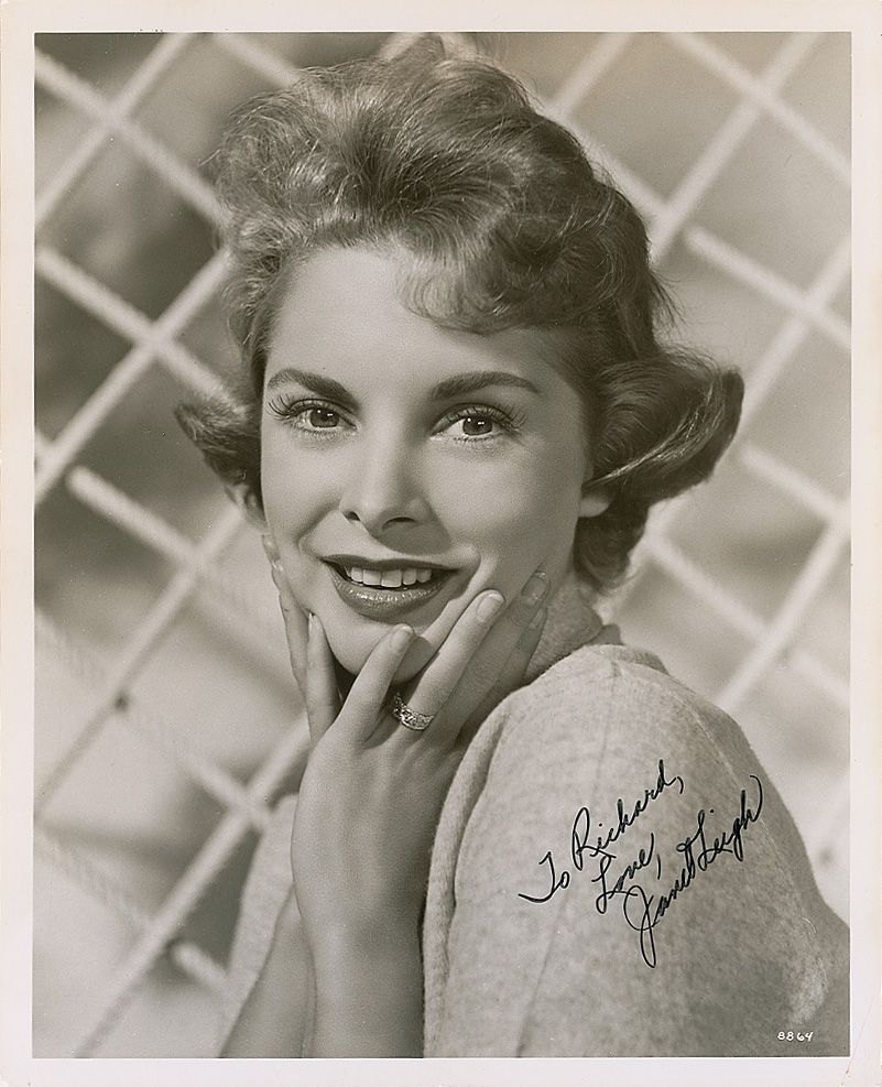 Delightful glossy 8 x 10 doubleweight MGM publicity photo of Leigh, signed and inscribed in black felt tip “To Richard, Love, Janet Leigh.” In fine condition, with a couple paperclip impressions in upper left and light creases in corners.