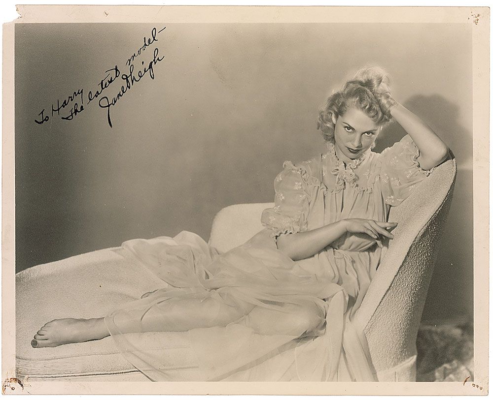 Vintage matte-finish 10 x 8 photo of Leigh posing on a chaise longue, signed and inscribed in fountain pen, “To Harry, The latest model—Janet Leigh.” In very good to fine condition, with paper loss to upper left corner and rusty tack holes and marks to other corners; flaws could be easily matted out for seductive display.