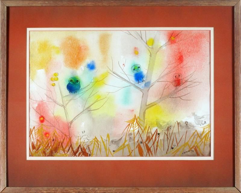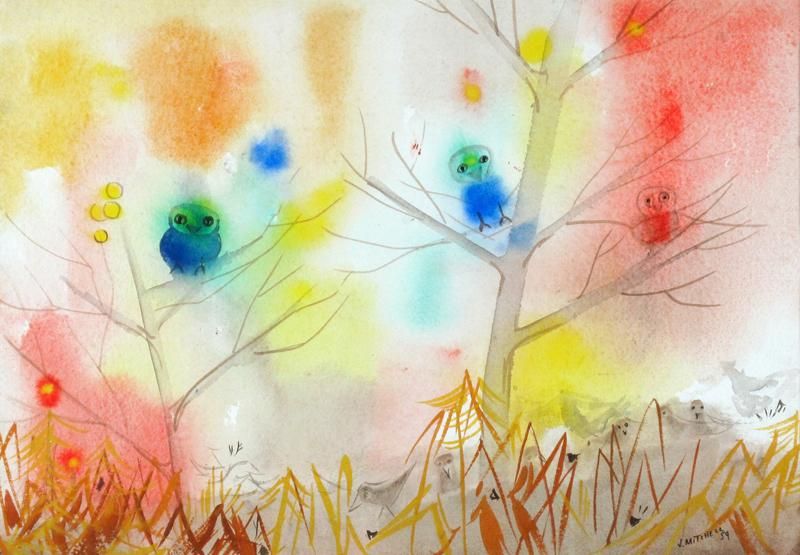 OWLS AND BIRDS IN AUTUMN TREES; 1959