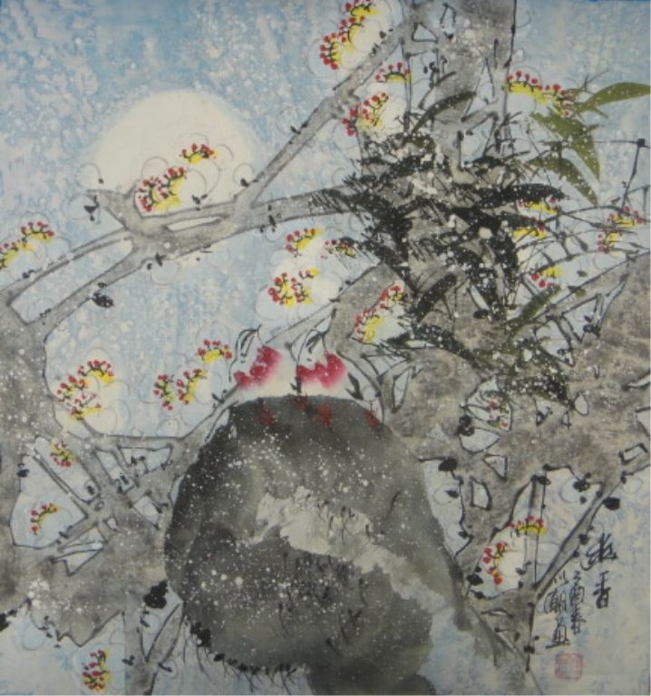 Prunus, Chinese ink and watercolour on paper; signed Jang Yi Chow and inscribed with one artist seal; 20th Century; 53.35 cm x 51 cm