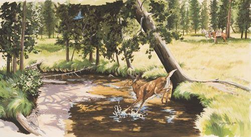 Janine Grende Utter (Idaho). "Startled". 16" x 30". Gouache on Board. Fine condition. (est $600-800)
