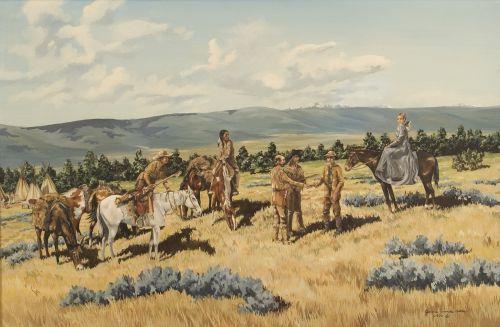 Janine Grende Utter (Idaho). "Narcissa and Marcus Whitman Meeting Jim Bridger - 1836". 24" x 36". Oil on Board. Fine condition. (est $1,000-1,500)
