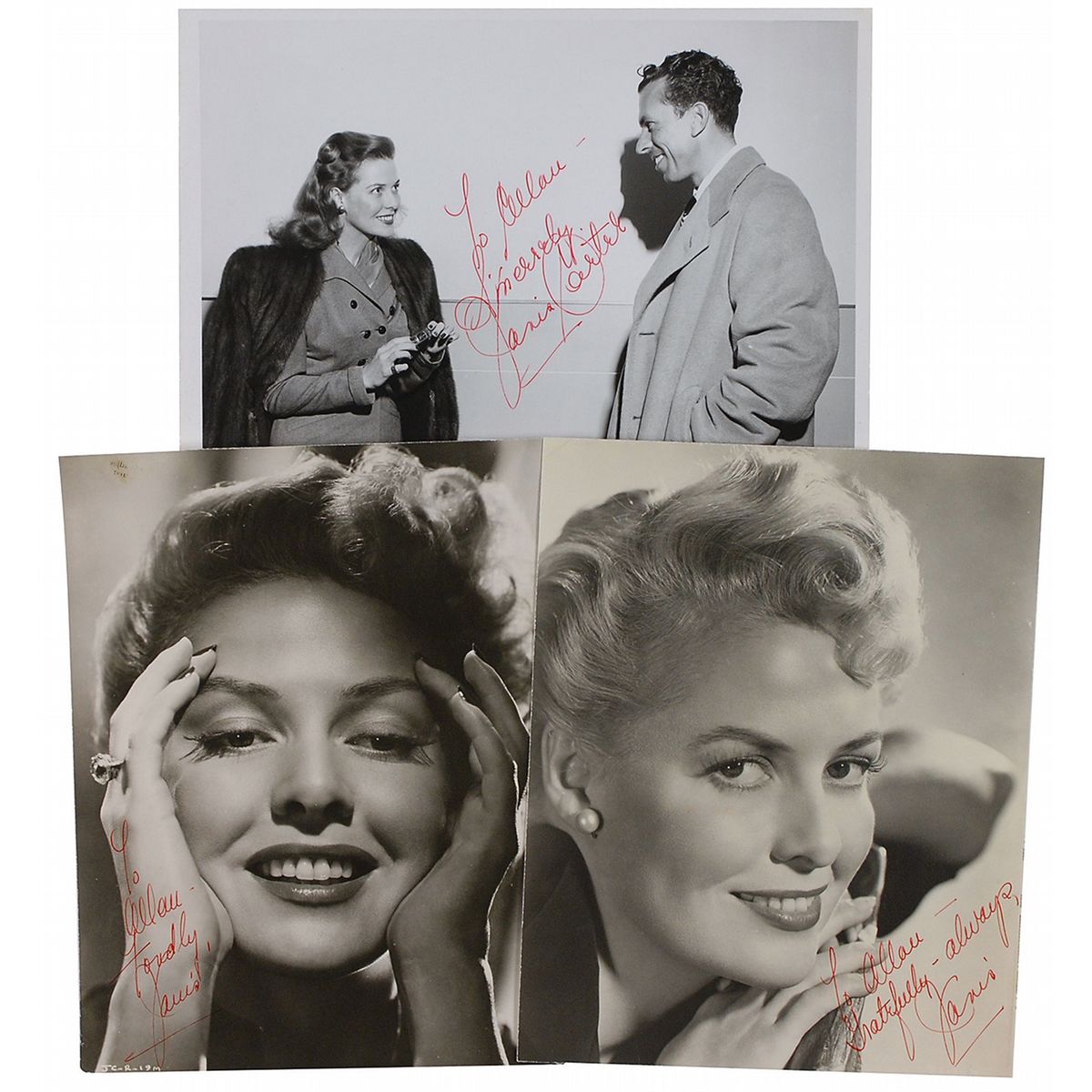 Two vintage signed photos, both approximately 7.5 x 9.25, one glossy and one matte-finish, each signed and inscribed in red ink, and a glossy 10 x 8 photo, also signed and inscribed in red ink. In very good condition, with slightly trimmed edges, and a couple of noticeable diagonal creases to the smaller glossy photo.