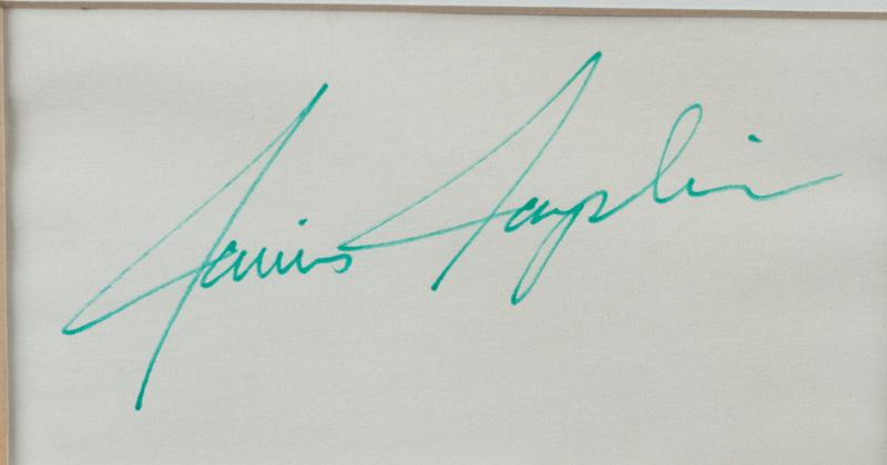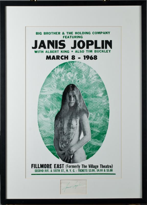 Concert poster for Big Brother & The Holding Company featuring Janis Joplin for March 8-1968, depicting a nude image of Janis. Matted and framed behind glass, includes a cut 3.5" H x 4" W section below poster signed by Janis Joplin in green fountain pen. 29" h x 21" W, including frame. COA from Rookie King, Ltd. included.