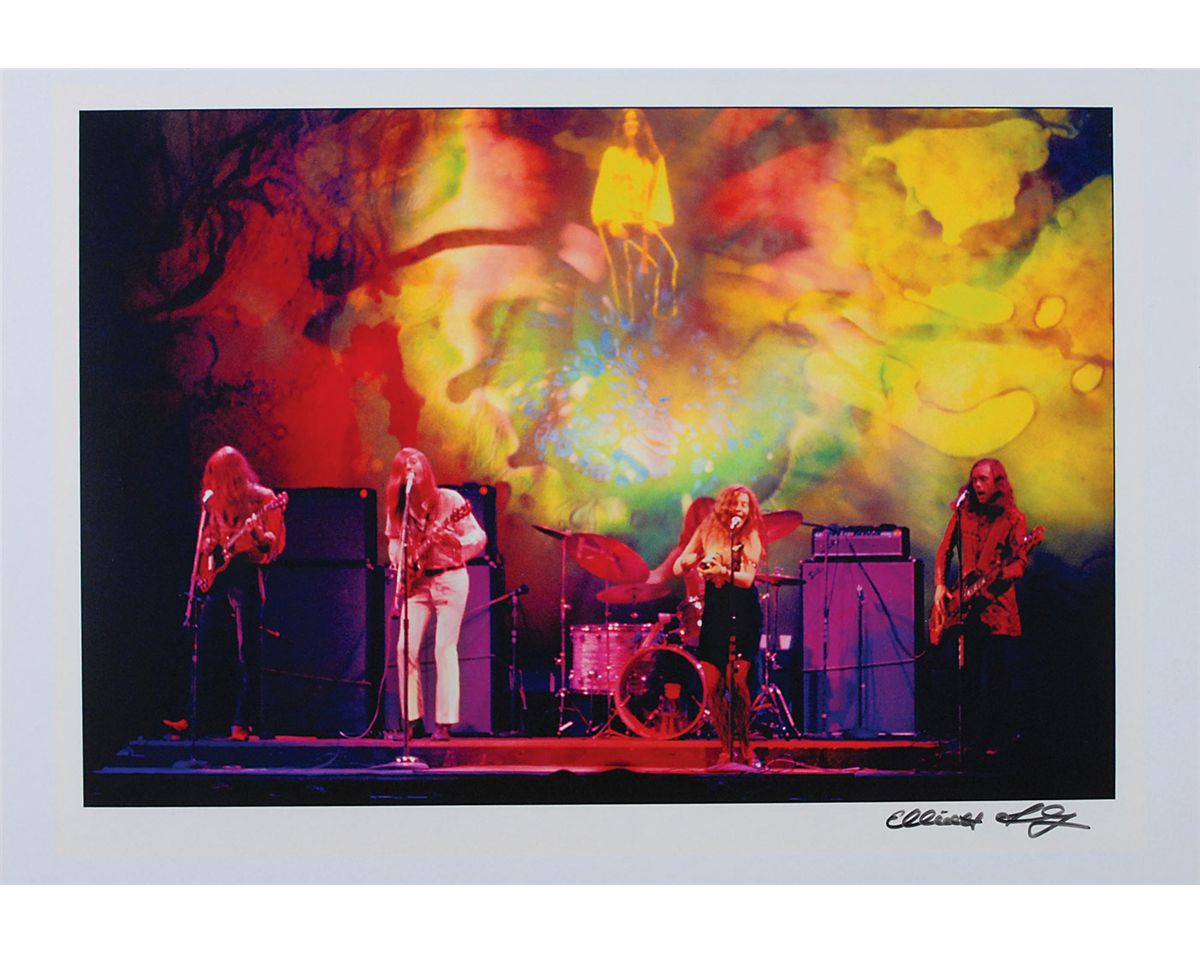 Color 19 x 13 archival giclee print of Joplin on stage at the Fillmore East in 1968, signed in the lower border in black felt tip by Landy. In fine condition.