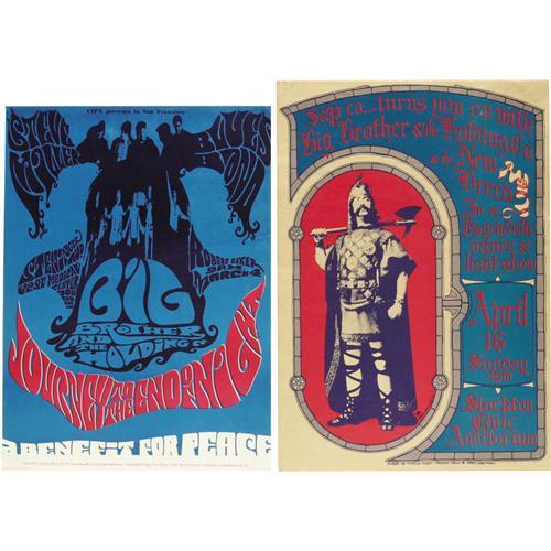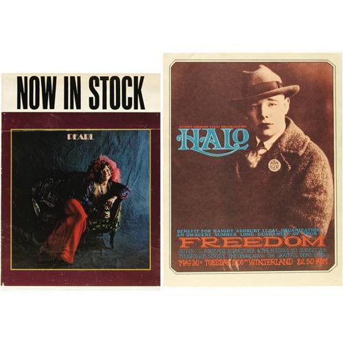 <B>Janis Joplin Poster and Memorabilia, Group of 12 (1967-71)</B></I> Fan's of the almighty "Pearl" are going to dig this lot. In it you will get the following: Big Brother and the Holding Company in Stockton, Ca (1967), Big Brother and the Holding Company at UCSF (1967), Big Brother and the Holding Company at Winterland (1967), a promo slick for the album "Pearl" (1971), a Janis poster that was a newspaper supplement (1968), two unpublished photographs of Janis singing, a Big Brother and the Holding Company handbill from the Great Highway (1971), a Fillmore postcard (BG-165, 1969), and three Avalon Ballroom postcards (FD-60, FD-65, FD-77, 1967). The condition varies heavily in this lot, most of the posters are GD/VG while the handbills and postcards are NM-. Whether you are a beginner, or advanced, collector of Janis Joplin, this lot will have something for you!