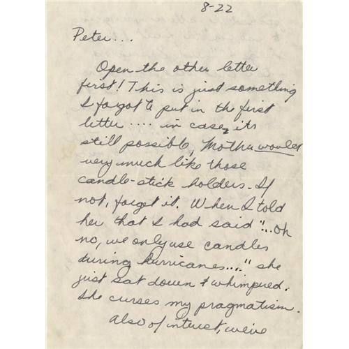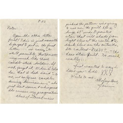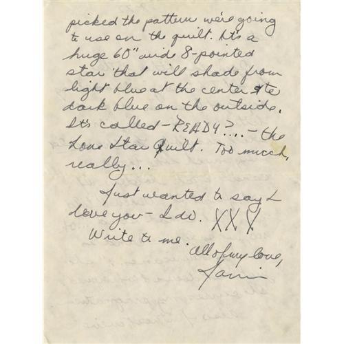 <B>Janis Joplin Letter.</B></I> A one-page, double-sided letter from Joplin to fiance Peter de Blanc, handwritten by her in black ink. Dated August 22 (no year given), it covers minor details ranging from candles to quilts before concluding: "Just wanted to say I love you -- I do. XXX/ Write to me. All of my love, Janis." In Excellent condition with a fold crease and very minor wear and discoloration to the edges. <I>With COA from PSA/DNA.</B></I>