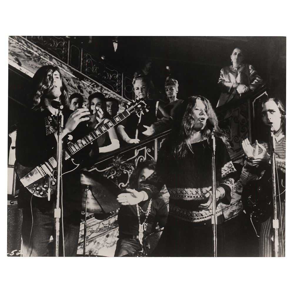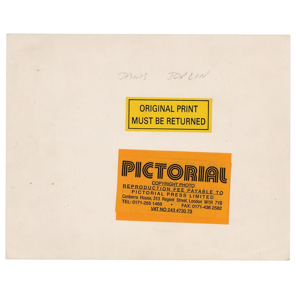 Original circa 1968 vintage glossy 10 x 8 photo of Janis Joplin singing with Big Brother and the Holding Company on stage during a concert performance. The reverse bears an affixed Pictorial Press copyright label and a label marked “Original Print, Must Be Returned.” In fine condition.