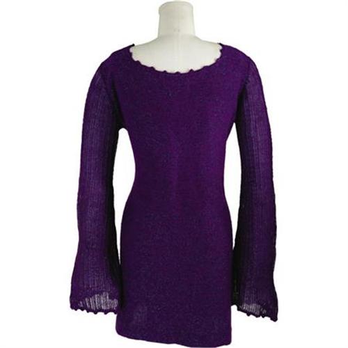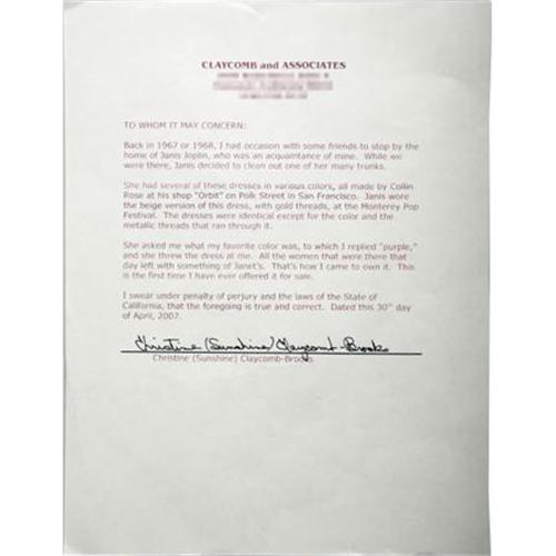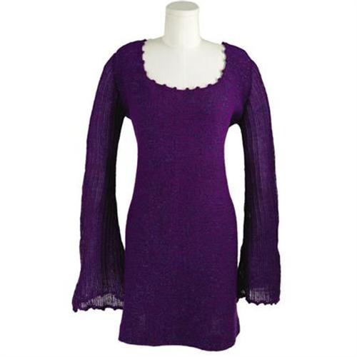 <B>Janis Joplin's Knit Dress.</B></I> A gorgeous, scoop-necked knit mini-dress, Colin Rose original design, owned and worn by Janis Joplin. A gift from Joplin to Christine Brooks, then Publicity Director for the Fillmore, this dress was one of two Joplin owned of the same design; the other was the beige version she wore at the Monterey Pop Festival, her first major public appearance. Given to Brooks on a visit to Joplin's home, the dress has been a treasured item ever since; this is the first time the piece has been available for auction. Luminous metallic blue threads woven throughout the violet dress add glimmer, and while incredibly short (it's a very mini mini), the dress must have looked stunning on Joplin, with its bell sleeves accentuating her every gesture. A rare, one of a kind treasure from the wardrobe of "Pearl." In Very Fine condition with three very small pulls to knitwork. <I>Accompanied by LOA from Christine Brooks.</B></I><BR><BR><b>Shipping:</b> Clothing, Costumes & Jerseys (<a target="_blank" href="http://www.heritageauctions.com/common/shipping.php">view shipping information</a>)