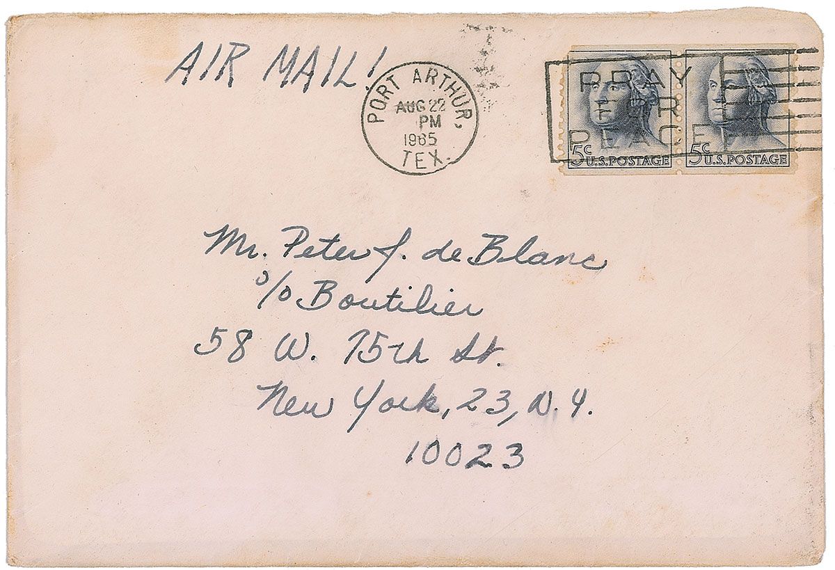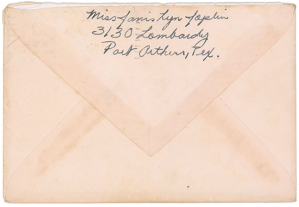 Hand-addressed mailing envelope, 6 x 4, addressed by Joplin to, “Mr. Peter de Blanc / c/o Boutilier / 58 W. 75th St. / New York, 23, N.Y / 10023,” and notated at the top “Air Mail!” Reverse bears Joplin’s return address, which includes her full signature, “Miss Janis Lyn Joplin / 3130 Lombardy / Port Arthur, Tex.” Envelope also bears an August 22, 1965, Port Arthur, Texas, postmark. In fine condition, with a bit of scattered light soiling. The recipient of this envelope was Joplin’s boyfriend, Peter de Blanc, to whom Joplin wrote often during a part of 1965 with aspirations of eventual marriage. Items signed with the psychedelic rocker’s full signature are extremely scarce.