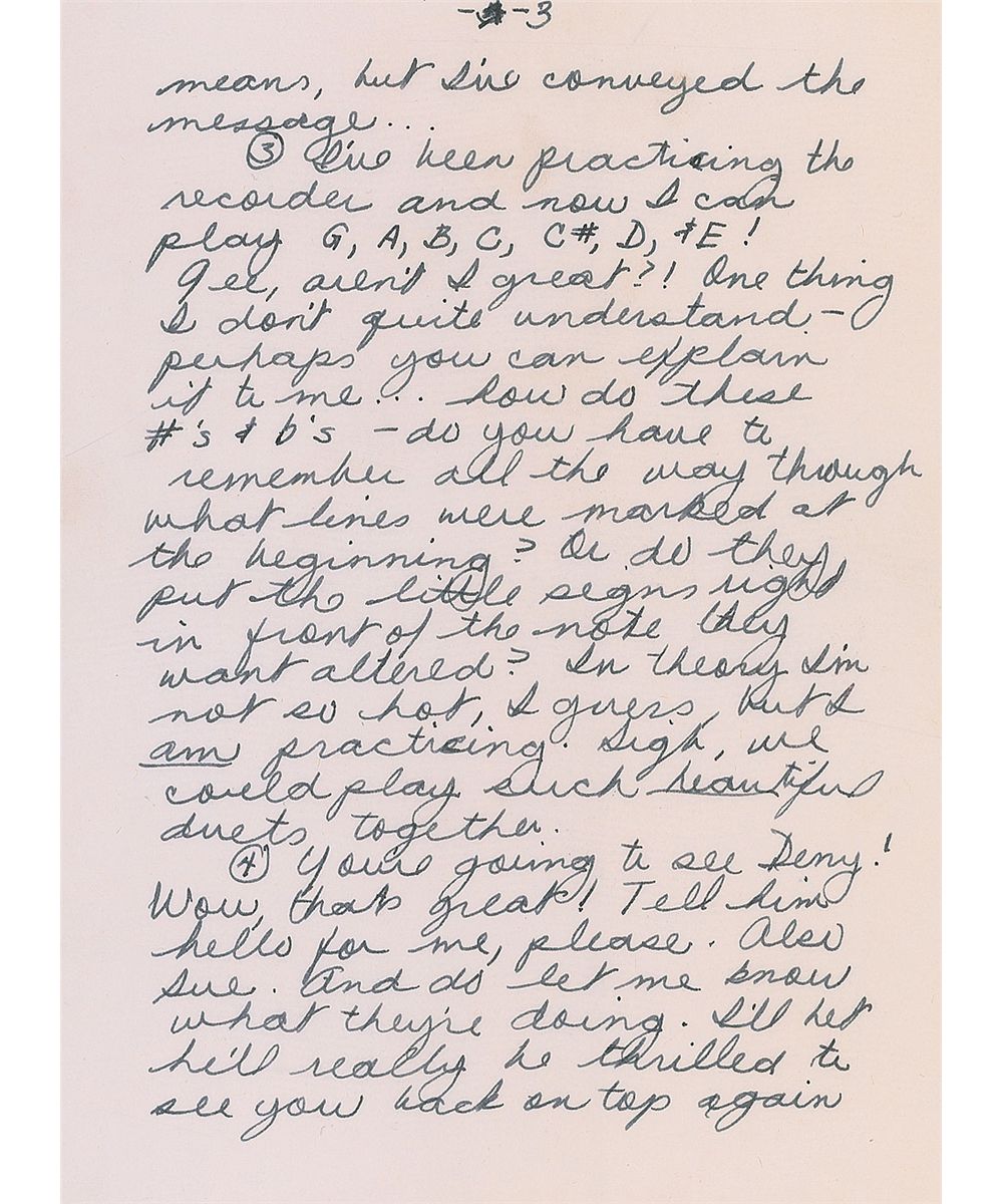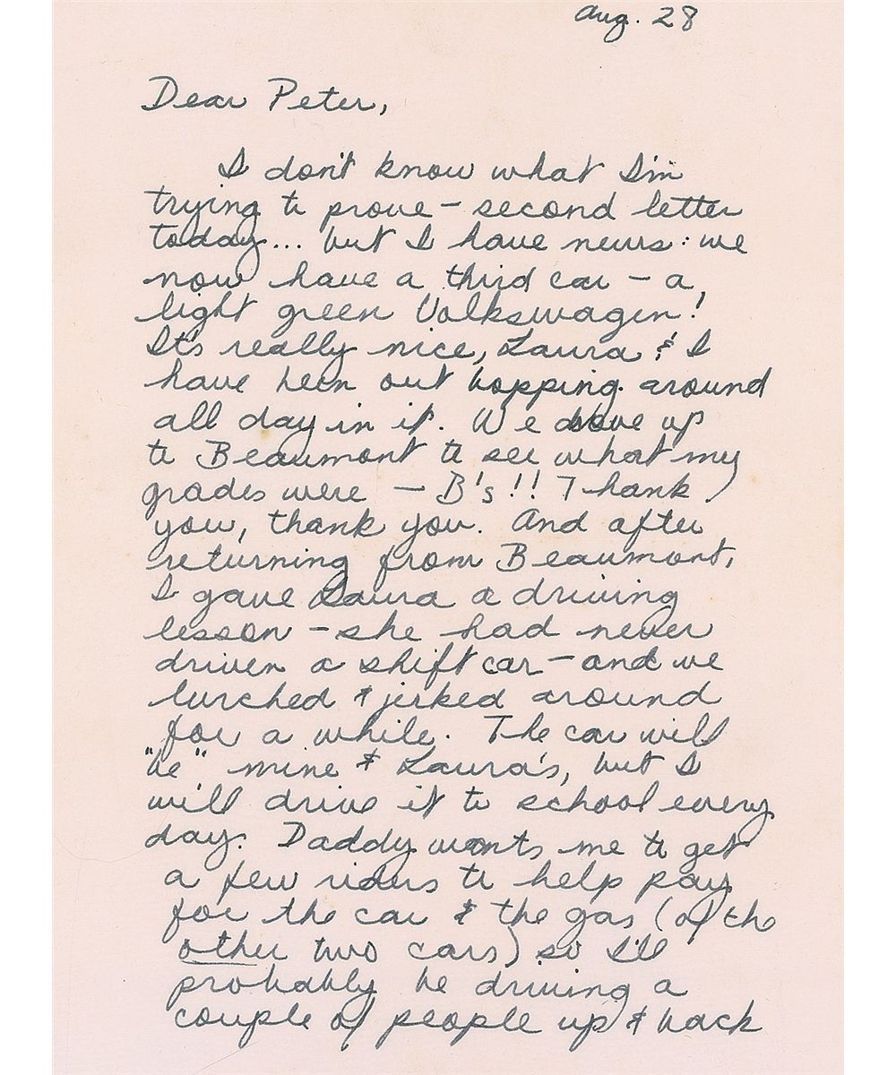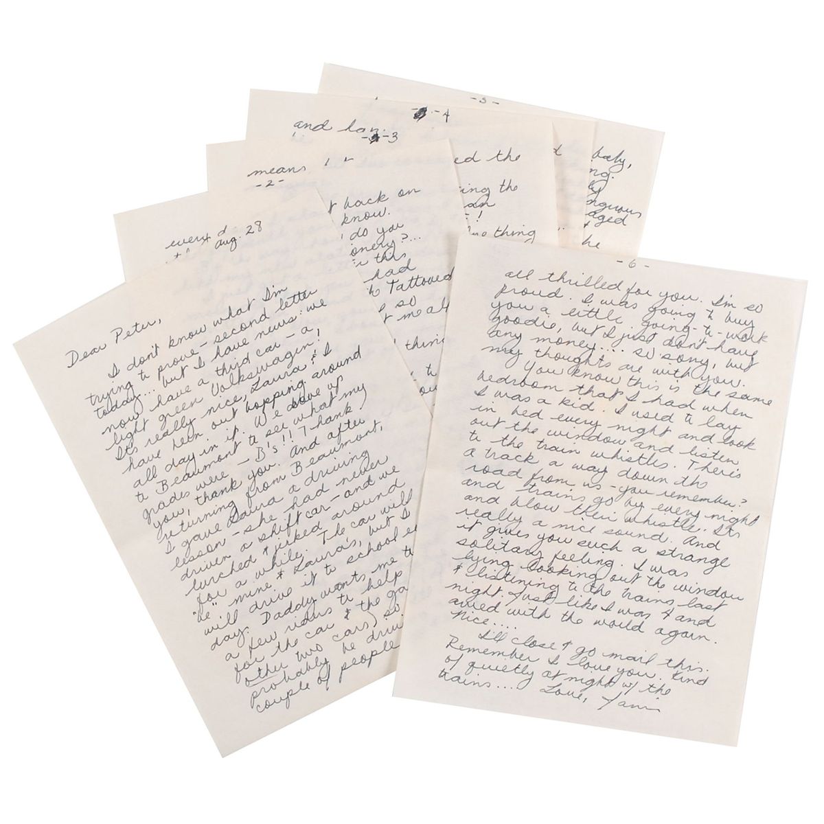 ALS signed “Love, Janis,” six pages, 5.75 x 8, August 28, [1965]. Letter to her boyfriend Peter de Blanc. In part: “I don’t know what I’m trying to prove—second letter today…but I have news: we now have a third car—a light green Volkswagon! It’s really nice, Laura & I have been hopping around all day in it. We drove up to Beaumont to see what my grades were—B’s!! Thank you, thank you…I’ve been practicing the recorder and now I can play G, A, B, C, C#, D & E! Gee, aren’t I great! One thing I don’t quite understand—perhaps you can explain to me…how do these #’s and [music note]—do you have to remember all the way through what lines were marked at the beginning? Or do they put the little signs right in front of the note they want altered? In theory, I’m not so hot, I guess, but I am practicing. Sigh, we could play such beautiful duets together…You know Peter, it’s really great—we’re still making it. I mean, we’re apart & still love each other. I really do love you more each day. We’ll probably really make it—through any kind of troubles, I mean—we just keep trying. I really love you baby, and I intend to keep trying no matter what (practically…) cause it’s really worth it. I’ve never been happy before, you know, ever. And now I am, because of you and well it’s just worth it. We should make it…I was lying looking out the window & listening to the trains last night. Just like I was 4 and awed with the world again. Nice.” In very fine condition.