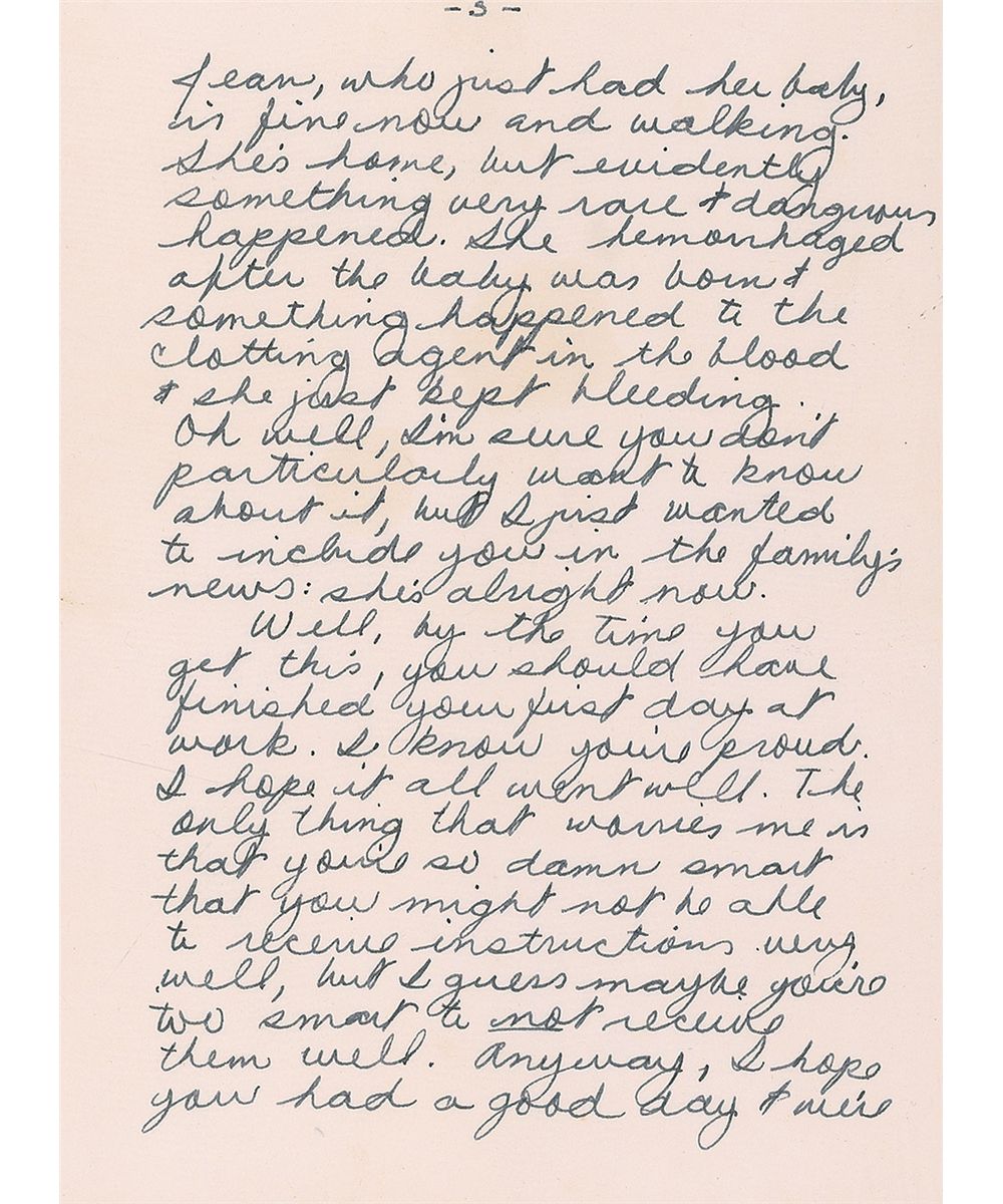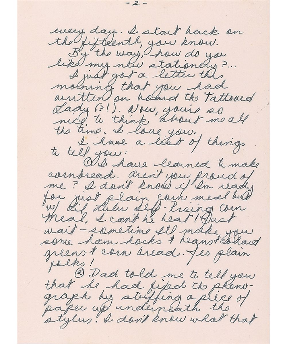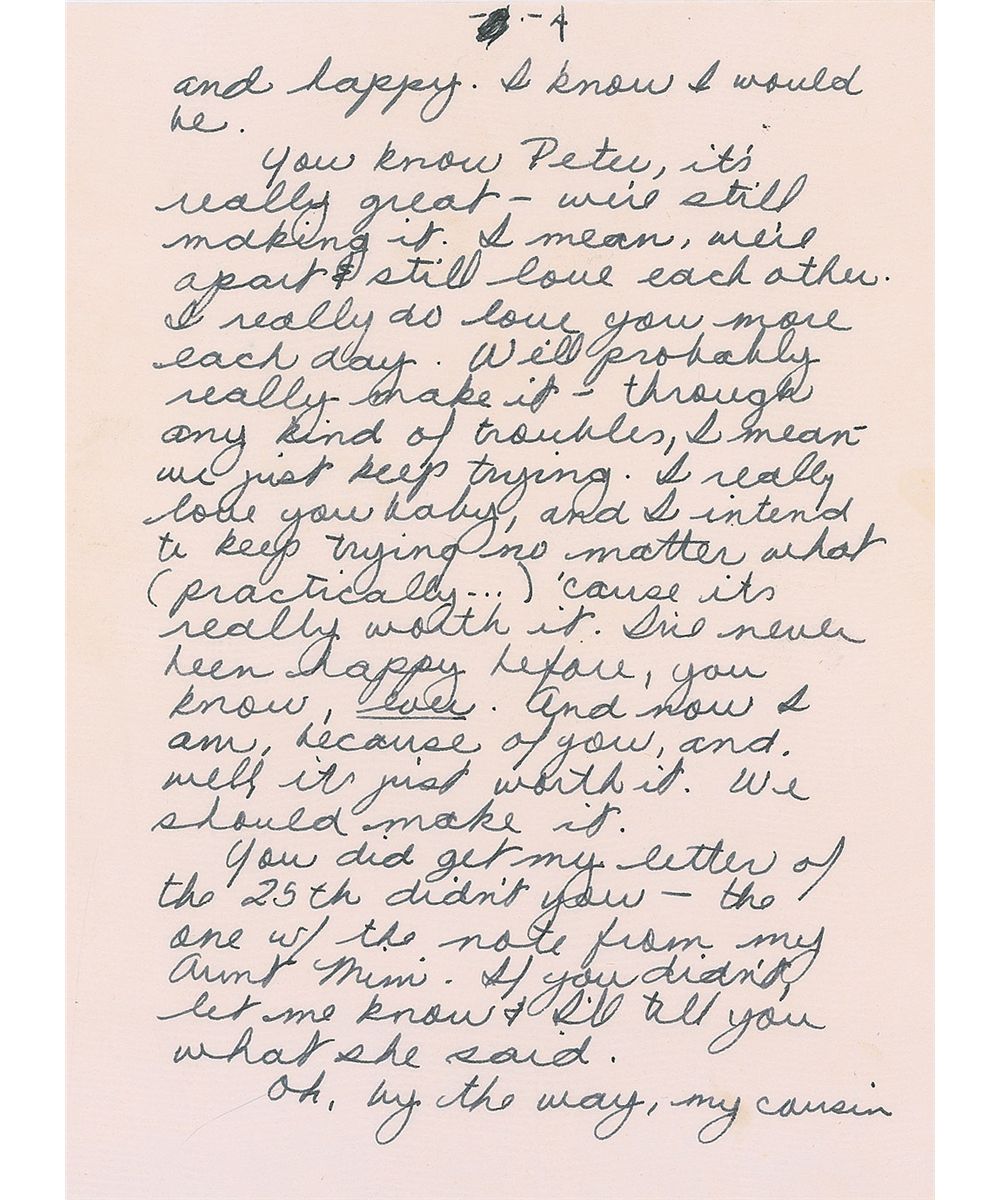 ALS signed “Love, Janis,” six pages, 5.75 x 8, August 28, [1965]. Letter to her boyfriend Peter de Blanc. In part: “I don’t know what I’m trying to prove—second letter today…but I have news: we now have a third car—a light green Volkswagon! It’s really nice, Laura & I have been hopping around all day in it. We drove up to Beaumont to see what my grades were—B’s!! Thank you, thank you…I’ve been practicing the recorder and now I can play G, A, B, C, C#, D & E! Gee, aren’t I great! One thing I don’t quite understand—perhaps you can explain to me…how do these #’s and [music note]—do you have to remember all the way through what lines were marked at the beginning? Or do they put the little signs right in front of the note they want altered? In theory, I’m not so hot, I guess, but I am practicing. Sigh, we could play such beautiful duets together…You know Peter, it’s really great—we’re still making it. I mean, we’re apart & still love each other. I really do love you more each day. We’ll probably really make it—through any kind of troubles, I mean—we just keep trying. I really love you baby, and I intend to keep trying no matter what (practically…) cause it’s really worth it. I’ve never been happy before, you know, ever. And now I am, because of you and well it’s just worth it. We should make it…I was lying looking out the window & listening to the trains last night. Just like I was 4 and awed with the world again. Nice.” In very fine condition.