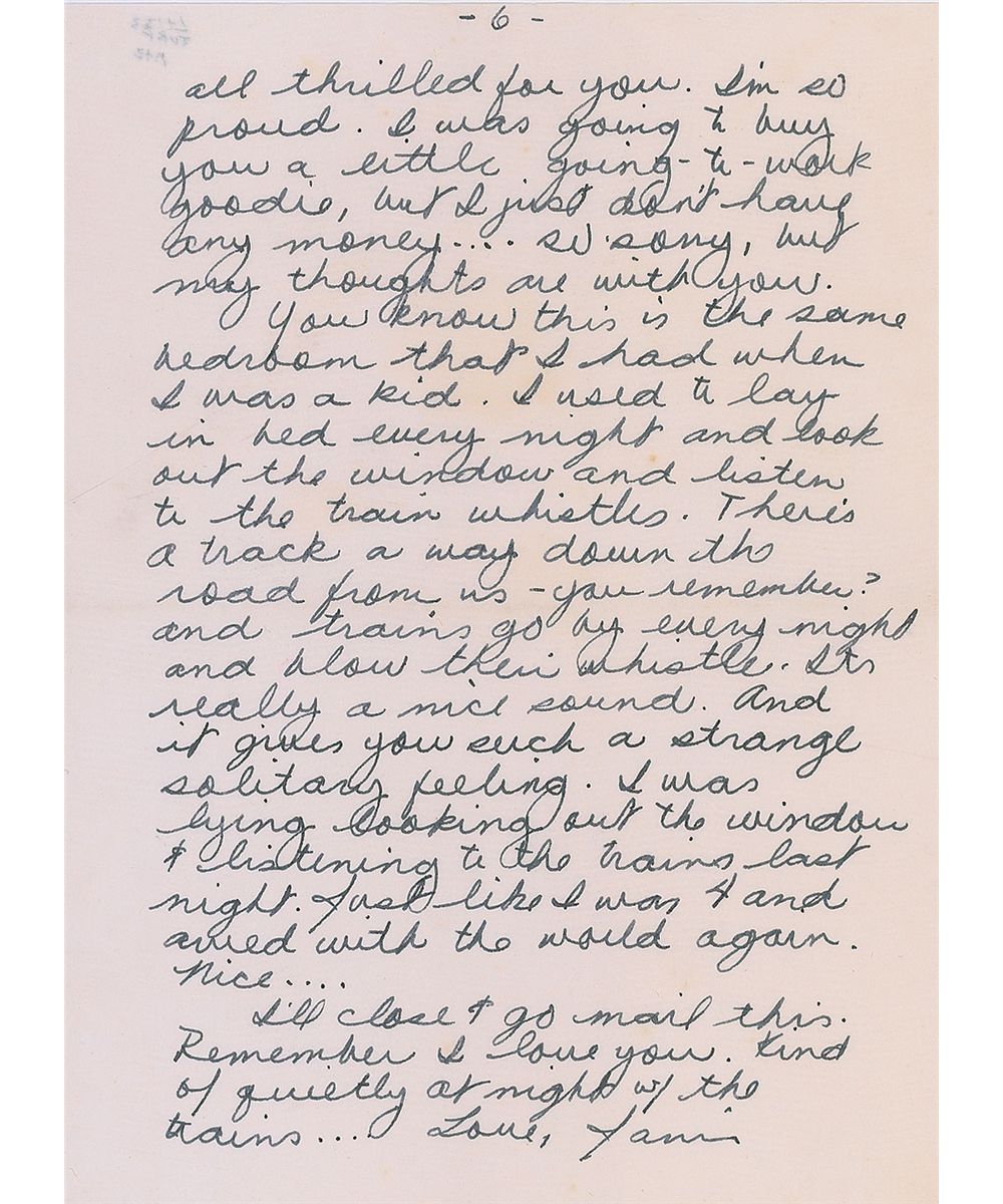A desperate intervention by her friends in San Francisco sent Joplin back to her home of Port Arthur in 1965. She avoided drugs and alcohol, enrolled as an anthropology major at Lamar University in nearby Beaumont, Texas, and commuted to Austin to perform solo, accompanying herself on guitar. During this period, she wrote de Blanc frequently, as she struggled to balance her desires for a peaceful private existence with her passion for the rock and roll lifestyle. Unfortunately, after formally asking her family's permission to marry her, de Blanc broke off the engagement, left the bay area, and relocated back to New York in 1966; Joplin returned to San Francisco in June of that year and joined Big Brother. A very hopeful and optimistic letter as Joplin continued on her road to sobriety and hopes of settling down.