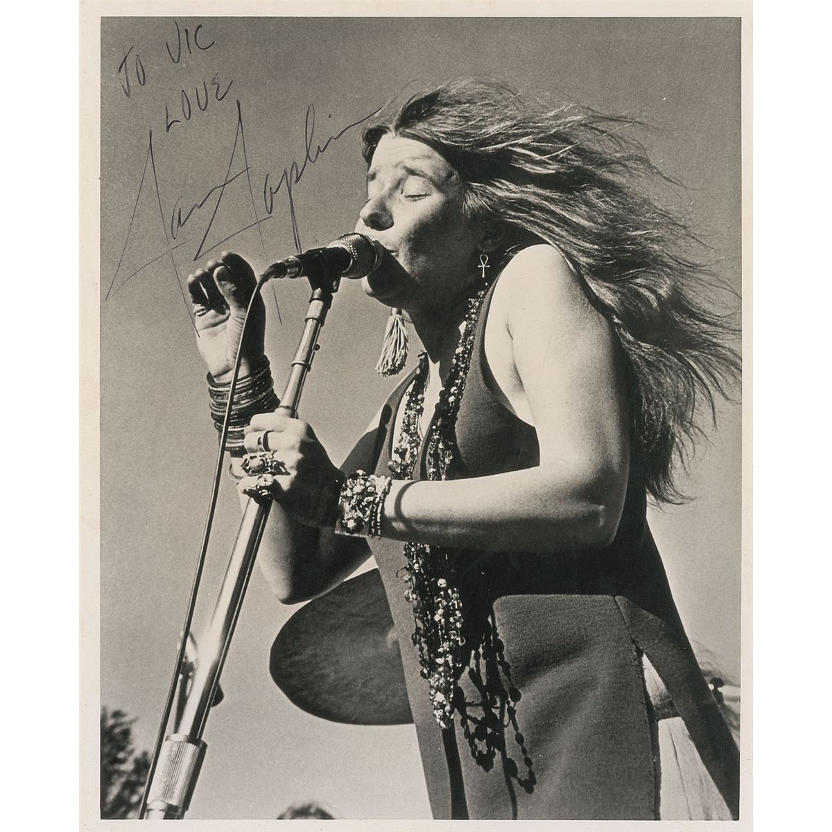 Extraordinarily scarce vintage glossy 8 x 10 photo of Joplin singing into a microphone on an outdoor stage, signed and inscribed in black felt tip “To Vic, Love, Janis Joplin.” Some scattered creases and tape remnants to reverse of horizontal edges, otherwise fine condition. Only the second 8 x 10 of Joplin we have ever offered, making this a true rock rarity.